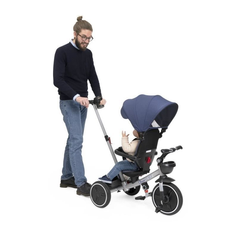 Ce tricycle évolutif propose 4 modes d'utilisations, adaptés aux différentes étapes de développement de votre enfant : Des 6 mois le tricycle s'utilise avec le siege dos a la route, guidé par le parent grâce a la poignée directionnelle et réglable en hauteur sur 2 positions. Le siege offre confort et sécurité grâce au revetement en tissu et au systeme de harnais a 4 points. a partir d'un an l'enfant peut passer face a la route, toujours guidé par le parent. Le canopy dispose d'une inclinaison réglable et peut etre retiré dans un 3eme mode, a partir de 18 mois. a partir de 3 ans, l'enfant développe sa motricité en utilisant le tricycle de façon autonome. Ce tricycle se transporte facilement grâce a son pliage compacte. Pour plus de confort durant les balades, il dispose d'un porte gobelet, d'un crochet pour accrocher des sacs et de deux paniers, a l'arriere et a l'avant.