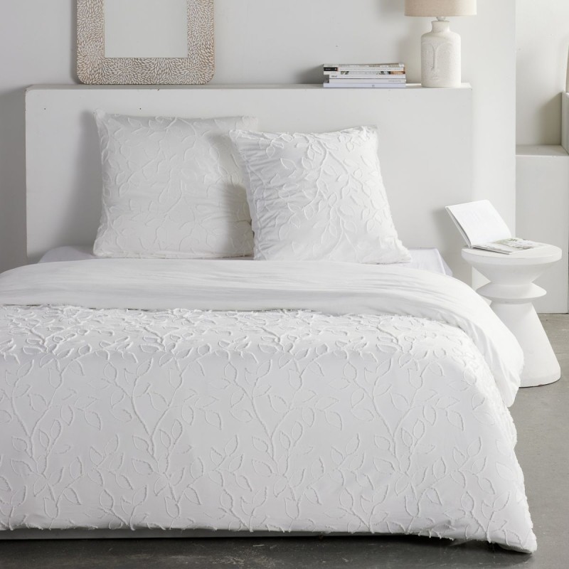 Un souffle de romantisme et de douceur ! La parure de lit Essential effet tufté floral par Today apporte charme et confort a votre chambre. Elle se compose d'une housse de couette 220x240 cm et de 2 taies d'oreiller 63x63 cm pour lit 2 personnes. Sa composition 100 % polyester (100 g/m²) garantit légereté, séchage rapide et zéro repassage. Lavage facile a 40 °C. Son motif floral tufté blanc crée une atmosphere élégante et apaisante. Un linge de lit pratique et raffiné pour des nuits douces et stylées !