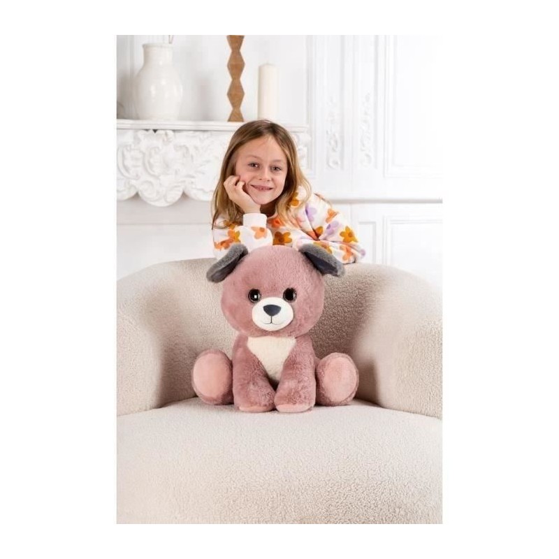 Chien en peluche de 40 cm.Découvrez le chien rose et gris en peluche issu de la jolie famille des Puppy Eyes Pets : des animaux tout doux aux grands yeux brillants et expressifs. Ce chien en position assise de 40 cm est ultra doux, tendre et affectueux, il n'attend qu'a etre adopté ! Des la naissance