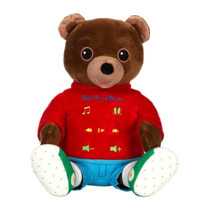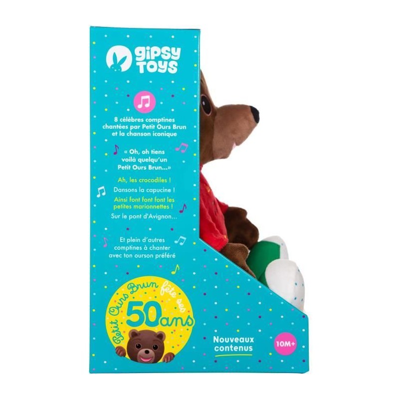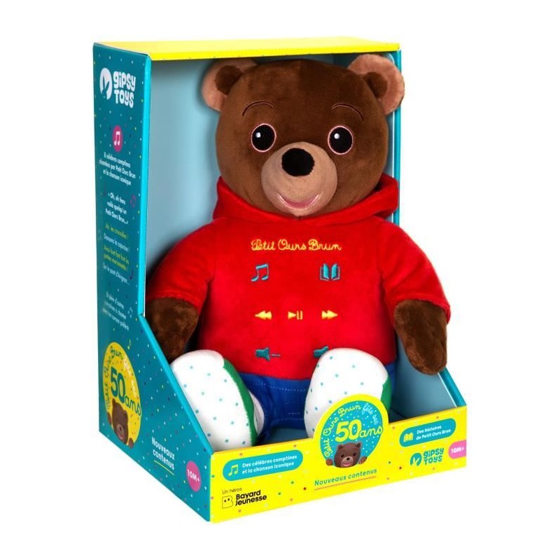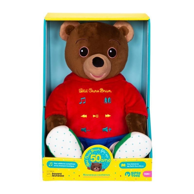 Peluche musicale et conteuse d'histoires. Edition spéciale pour feter les 50 ans de Petit Ours Brun. Des 10 mois. Réglage du volume sonore. 3 piles LR03 fournies et remplaçables. Nettoyage en surface avec un linge humide.