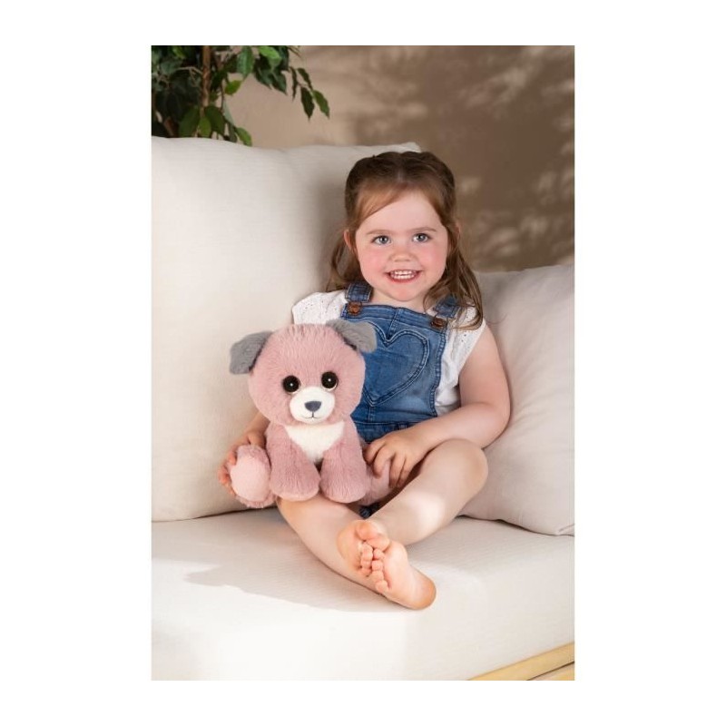 Chien en peluche de 22 cm.Découvrez le chien rose et gris en peluche issu de la jolie famille des Puppy Eyes Pets : des animaux tout doux aux grands yeux brillants et expressifs. Ce chien en position assise de 22 cm est ultra doux, tendre et affectueux, il n'attend qu'a etre adopté ! Des la naissance