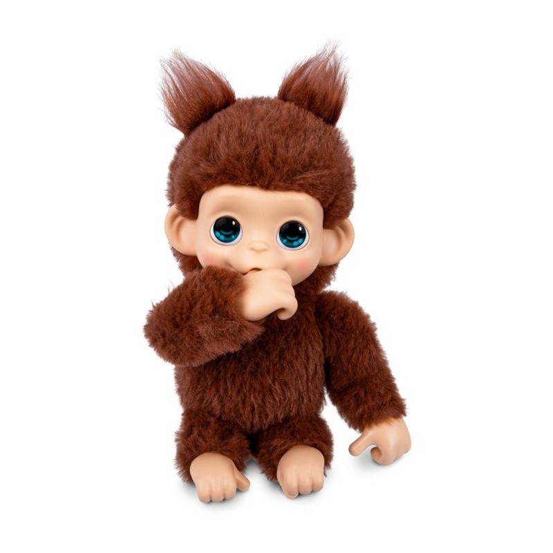 Adopte ton bébé singe interactif marron ! Il suce son pouce, rigole, réagit aux caresses et fait plus de 20 sons adorables. Avec ses mains réalistes, il s'accroche partout. Piles incluses. a collectionner des 4 ans !