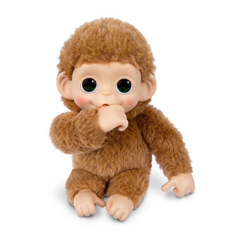 Craque pour le bébé singe caramel interactif ! Il suce son pouce, rigole, réagit aux caresses et fait plus de 20 sons trop mignons. Avec ses mains réalistes, il s'accroche partout. Piles incluses. Des 4 ans !