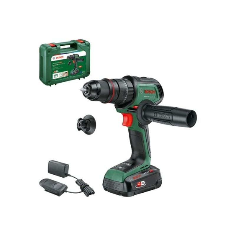 Perceuse a percussion avec batterie AdvancedImpact 18V-80 QuickSnap, Perçage et vissage polyvalents et hautes performances dans une grande variété de matériaux, Perçage et vissage puissants avec 82 Nm pour un couple maximal et une vitesse variable, moteur sans balais et mandrin métallique de 13 mm pour une plus longue durée de vie, Interface QuickSnap pour l'utilisation du capuchon magnétique ou des accessoires supplémentaires disponibles pour atteindre les espaces restreints, Travail sûr et précis avec un meilleur contrôle grâce a la poignée auxiliaire, Convient pour le perçage dans le bois, Technologie Syneon pour une puissance optimale et une autonomie maximale , Compatible avec Bosch 18V 18V POWER FOR ALL , 1 batterie PBA 18V 2.5Ah, Mandrin métallique interchangeable, Capuchon magnétique, Embout de tournevis, Poignée supplémentaire, Chargeur AL 18V-20, Mallette de transport