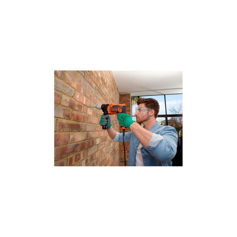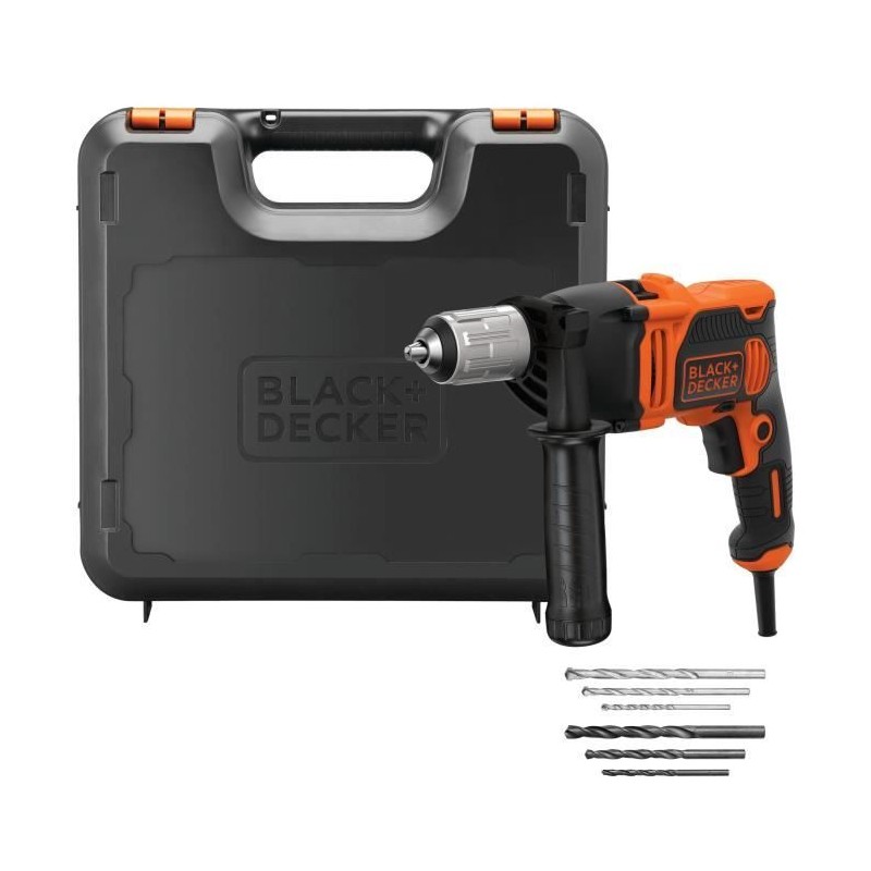 Perceuse a percussion électrique BLACK & DECKER BEH850K avec mandrin autoserrant, 2 vitesses mécaniques et 850W. Idéale pour divers travaux, elle est livrée avec une valise et des accessoires.