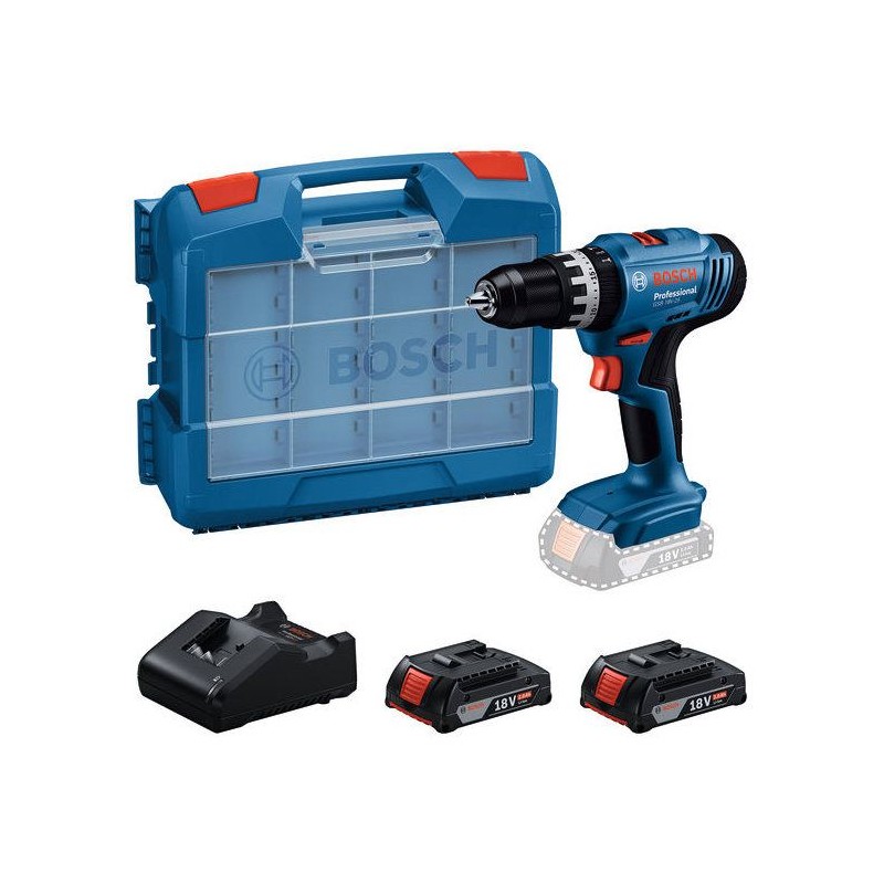 Perceuse a percussion sans fil BOSCH PROFESSIONAL - GSB 18V-25 - 2 batteries GBA 2,0Ah + chargeur GAL 18V-20 + 63 accessoires