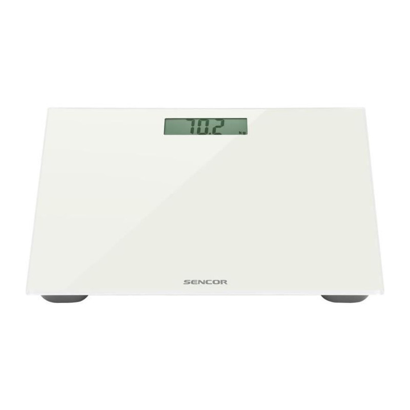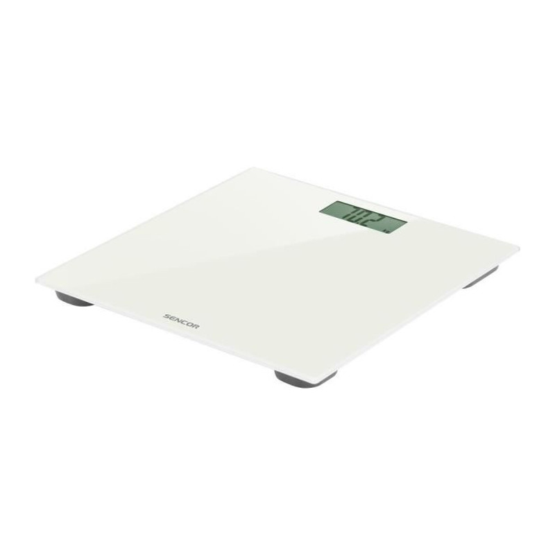 Pése Personne Sencor SBS 2301WH - Surface en verre pour un nettoyage facile Verre de sécurité trempé (5 mm) Design fin (21 mm) Poids jusqu'a 150 kg (sensibilité 100 g) 4 capteurs de haute précision pour un pesage précis Fonction de mise en marche automatique (pese immédiatement lorsque l'on marche dessus) Écran LCD extra large (74 x 28,5 mm) Fonction de verrouillage des données pour une mesure plus précise (le poids mesuré reste affiché pendant 10 secondes) Option de sélection des unités de mesure (kg/lb) Indicateur de batterie faible et de surcharge Arret automatique en cas d'inactivité Source d'alimentation : 1 pile au lithium CR2032 (incluse)