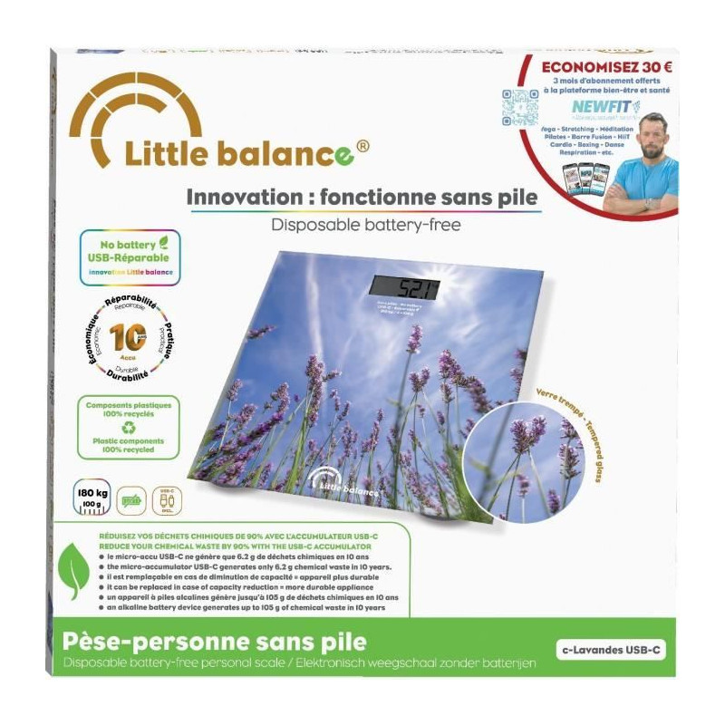 Apportez une touche de fraîcheur a votre salle de bain avec le pese-personne USB-C Lavandes de LITTLE BALANCE. Sans piles, il est rechargeable via USB type C avec un câble fourni. Sa batterie Li-Ion remplaçable et sa base en plastique recyclé a 100% en font un choix écologique. Supportant jusqu'a 180 kg avec une précision de 100 gr, il dispose d'un plateau en verre trempé de 28x28 cm et d'un écran LCD pour une lecture facile.