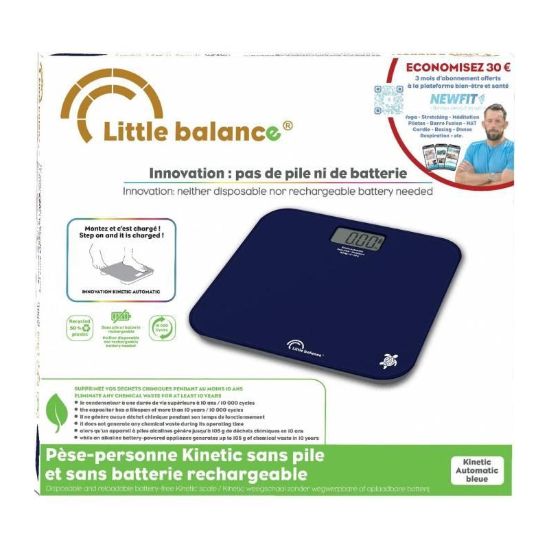 Profitez de la technologie innovante avec le pese-personne Kinetic Auto Bleu de LITTLE BALANCE. Sans piles, il se recharge a chaque utilisation grâce a la technologie Kinetic. Sa base en plastique recyclé a 50% et son plateau en verre trempé de 30x28 cm allient durabilité et élégance. Supportant jusqu'a 180 kg avec une précision de 50 gr, il offre une lecture facile grâce a son écran LCD.