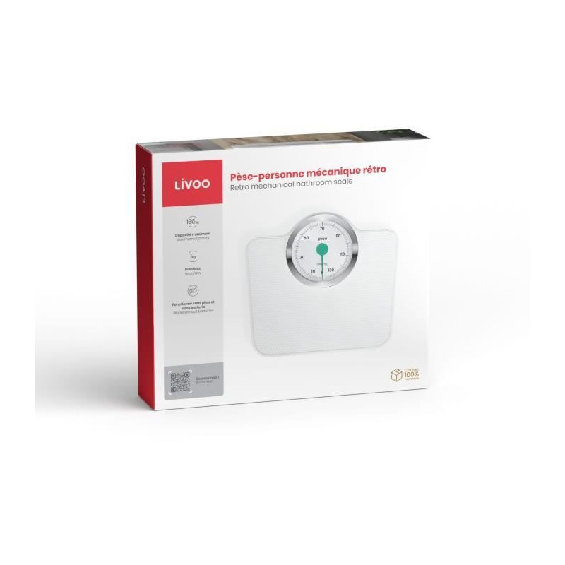 Le pese-personne mécanique rétro LIVOO DOM490 allie charme vintage et performance. Fonctionnant sans pile ni batterie, il offre une capacité maximale de 136 kg avec une précision de 1 kg. Son plateau en métal avec revetement antidérapant assure une utilisation en toute sécurité. Pratique et esthétique, il trouvera sa place dans votre salle de bain.