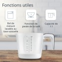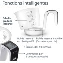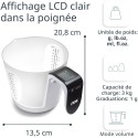 Balance et gobelet doseur numérique en un : balance de cuisine numérique avec une capacité maximale de 3 kg et gobelet doseur amovible adapté au lave-vaisselle pour peser et mesurer simultanément les liquides et autres ingrédients au gramme pres.Le gobelet gradué a une échelle estampée avec des incréments de 50 ml et des reperes supplémentaires pour 1/8 - 1/4 - 1/3 - 1/2. Le gobelet gradué est facilement amovible.Balance a gobelet numérique d'une capacité de 1 l avec grand écran LCD (29 x 29 mm) dans la poignée. Fonction pratique de pesée (tare), utilisation simple par boutons-poussoirs. Balance a gobelet gradué avec indicateur de surcharge et de niveau de batterie, arret automatique.Balance de cuisine et gobelet gradué. Unités de poids : g, ml, lb.oz et fl.oz. Ce gobelet doseur électronique avec mesure en litre pese en plus le volume des liquides et affiche la valeur sur l'écran.Précision de mesure, balance de cuisine idéale pour la pâtisserie, pour peser et mesurer au gramme pres des ingrédients comme le sucre, la farine, le beurre, les noix. Également utilisable comme balance pour aliments pour animaux.