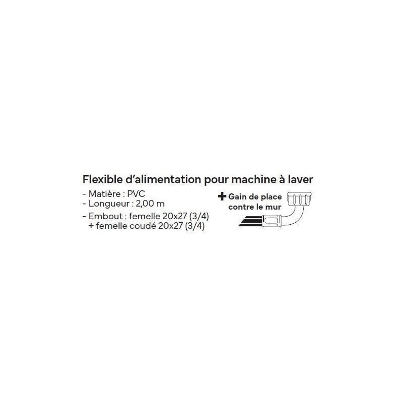 Ce flexible d'alimentation de 2 metres en PVC est conçu pour optimiser l'espace et la performance. Avec un embout femelle droit et un embout coudé 20x27, il assure une installation rapide et universelle, compatible avec tous les robinets standards. Idéal pour les petits espaces, il allie fiabilité et praticité.