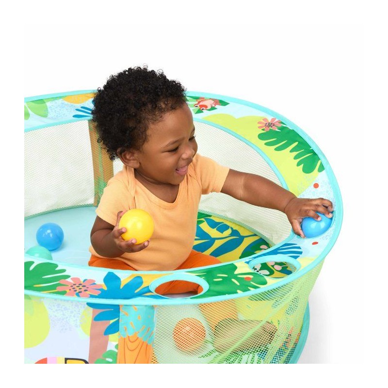 Préparez-vous a vous amuser avec la piscine a balles Rowdy Rainforest(TM) Bright Starts ! Cette piscine a balles pliable pour bébé est livrée avec 20 balles et un sac de transport pour s'asseoir et jouer où que la journée vous mene. Conçue avec soin, elle plonge votre petit explorateur dans une scene ludique de foret tropicale mettant en vedette les personnages animaux Bright Starts. Le rebord de la piscine a balles comprend 3 ouvertures pour faire tomber les balles, afin que bébé puisse pratiquer ses compétences motrices fines. Il suffit de la tordre et de la plier une fois le jeu terminé ! Ce tapis de jeu stimulant encourage le développement moteur pendant que bébé s'amuse a saisir, lancer, faire rouler et attraper les balles colorées. Coucou ! Les panneaux sont fabriqués en maille pour que vous puissiez garder un oeil sur l'action. Idéal pour les petits espaces et les voyages grâce a son rangement compact et pratique. Conçu pour les bébés des 6 mois et plus. S'ouvre sur un espace de jeu spacieux de 80 cm de diametre.