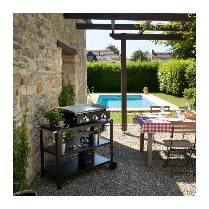 Plancha a gaz équipée de 3 brûleurs ronds pour une puissance totale de 7,5 kW, conçue pour des repas conviviaux de 8 a 10 personnes. Les dimensions hors tout sont de 67 × 47 × 24 cm. La surface de cuisson mesure 61 × 35 cm et est en acier inoxydable, assurant une excellente répartition de la chaleur et un nettoyage facile. La cuve est en acier peint pour plus de robustesse. L'appareil est livré a monter soi-meme. Il offre un excellent rapport qualité/prix, combinant performance, simplicité d'utilisation et facilité d'entretien. Idéal pour une utilisation réguliere en extérieur.
