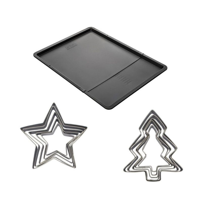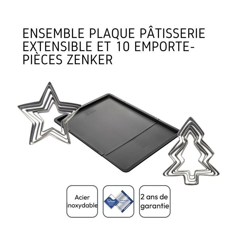 Ensemble avec 1 plaque a pâtisserie extensible et 2 lots de 5 emporte-pieces chacun avec formes d'étoiles et de sapins de 5 tailles différentes, réalisez de délicieux biscuits sablés de Noël grâce a cet ensemble complet. LE PETIT + : Ce plat a four est extensible et s'adapte a la taille de votre four. Vous pouvez cuire du poulet comme des biscuits de Noël. COMPOSITION et ENTRETIEN : Acier inoxydable, plaque revetement en Téflon antiadhérent, sans PFOA | Lavage a la main conseillé. DIMENSIONS : Emporte-pieces sapins : 11 x 9,5 cm | Emporte-pieces étoiles : 6 a 12 cm | Plaque extensible : 37-52 x 33 x 1,5 cm CONTENU : 1 plaque a pâtisserie extensible + 1 lot de 5 emporte-pieces étoiles + 1 lot de 5 emporte-pieces sapins La plaque a pâtisserie est extensible ce qui vous permet de réaliser plus ou moins de biscuits en fonction de vos besoins. Cette plaque de four est compatible avec tous les fours.. Elle est associée ici a 2 lots de 5 emporte-pieces  aux formes d'étoiles et de sapins de tailles différentes pour vous permettre de les superposer ou varier les tailles de vos biscuits. Zenker est une marque faisant partie du groupe Fackelmann Brands et elle propose une large gamme d'ustensiles de pâtisserie et de moules a gâteaux. Concernant les ustensiles de pâtisserie, Zenker frappe fort en mettant a disposition des ustensiles de préparation mais aussi de décoration pour les pâtissiers confirmés. Côté moules a gâteaux c'est une marque pionniere qui propose des innovations telles que les moules a gâteaux en silicone et fibre de verre ne nécessitant pas de matiere grasse et proposant des résultats de cuisson incroyables. Zenker possede donc une large gamme d'accessoires et d'ustensiles pour vous accompagner dans vos recettes du quotidien mais aussi pour des évenements exceptionnels comme les fetes, les anniversaires, les mariages, etc.