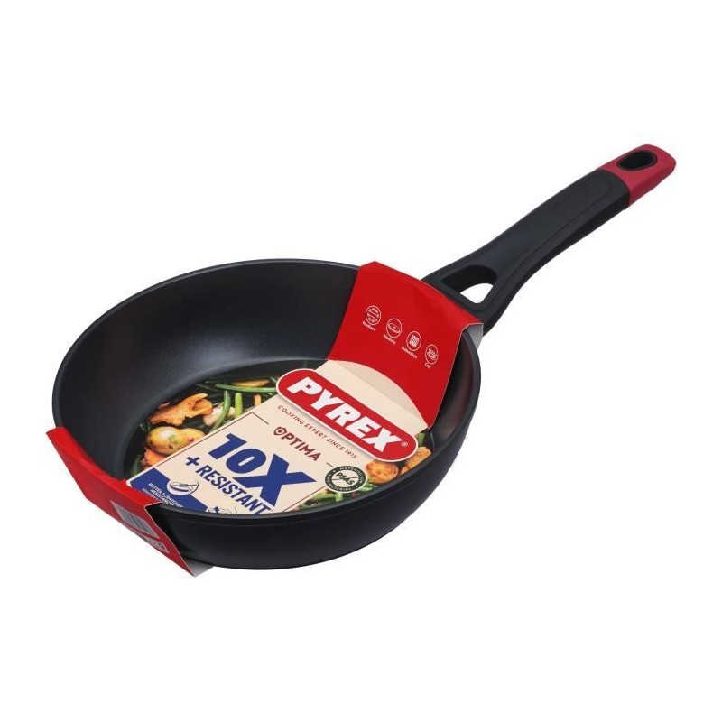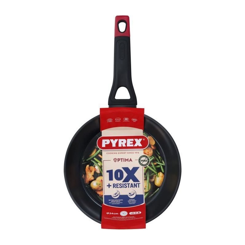 La poele idéale qui ne colle pas vite. La poele est en aluminium forgé et possede un revetement antiadhésif qui ne contient ni PFOA, ni plomb ni cadmium. Cela empechera vos aliments de brûler rapidement. En raison de l'aluminium, la casserole garantit une répartition uniforme de la chaleur et la casserole chauffera rapidement. De plus, la poele a une poignée durable en forme de Y avec une finition douce au toucher qui reste froide pendant la cuisson. La poele Pyrex est adaptée pour une utilisation sur des plaques a gaz, vitrocéramiques, halogenes et électriques. Pour maintenir de maniere optimale le fonctionnement du revetement antiadhésif, vous devez nettoyer la casserole a la main, car le lave-vaisselle peut endommager cette couche.