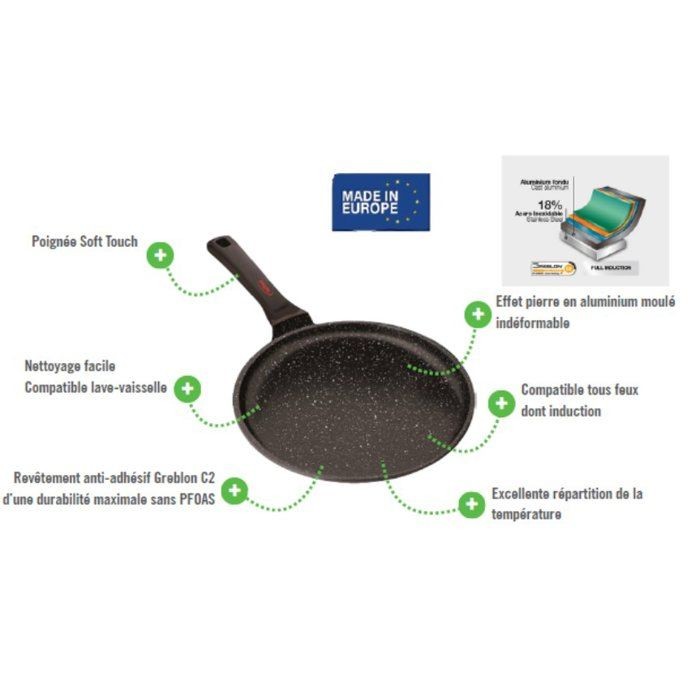 Préparez des crepes parfaites avec la poele INOXIBAR Ø26 cm ! Son design effet pierre en aluminium moulé indéformable et son fond en acier inoxydable de 6 mm assurent une excellente répartition de la chaleur. Le revetement anti-adhésif Greblon C2, sans PFOAS, garantit une cuisson saine avec peu ou pas de matiere grasse. Sa poignée Soft Touch offre confort et sécurité. Compatible tous feux, y compris induction, et lave-vaisselle, cette poele est idéale pour des moments gourmands et faciles a nettoyer.