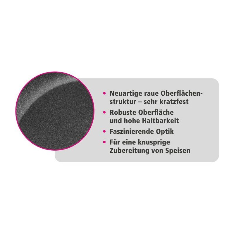 Polyvalente et performante, la poele-sauteuse GSW GOURMET TITANIUM GRANIT Advanced Ø24 cm est idéale pour saisir, faire revenir ou mijoter au quotidien. Fabriquée en fonte d'aluminium massive, elle assure une diffusion homogene de la chaleur et une excellente montée en température. Son revetement intérieur QUARZIT ROUGH effet pierre, garanti sans PFAS, offre une anti-adhérence durable pour une cuisine plus saine et un nettoyage facile. Compatible tous feux dont induction, elle dispose d'un fond indéformable pour une stabilité parfaite. Son manche ergonomique Soft Touch, complété par une poignée de soutien, garantit une prise en main confortable et sécurisée. Résistante jusqu'a 150 °C au four, cette poele-sauteuse noire au design moderne conjugue robustesse, praticité et plaisir de cuisiner.