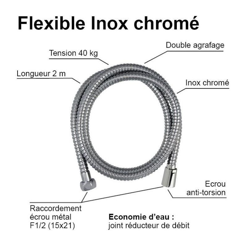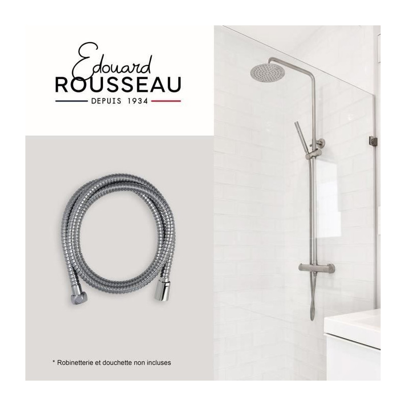 Flexible de douche - ROUSSEAU - Écrous métal anti-torsion - Réduction du débit - Longueur 2 m - Inox chromé double agrafage