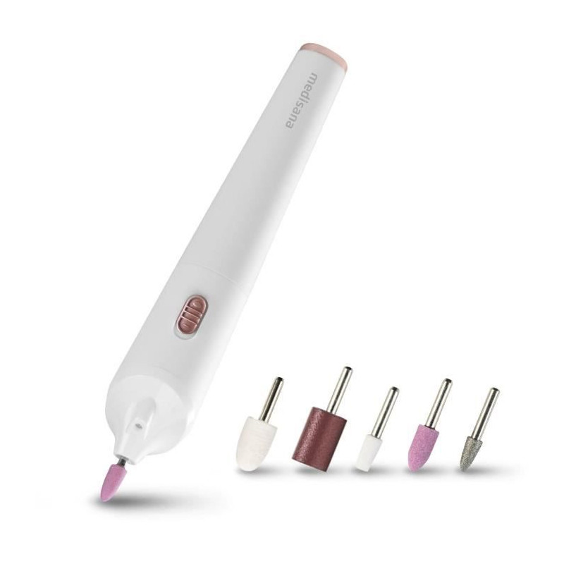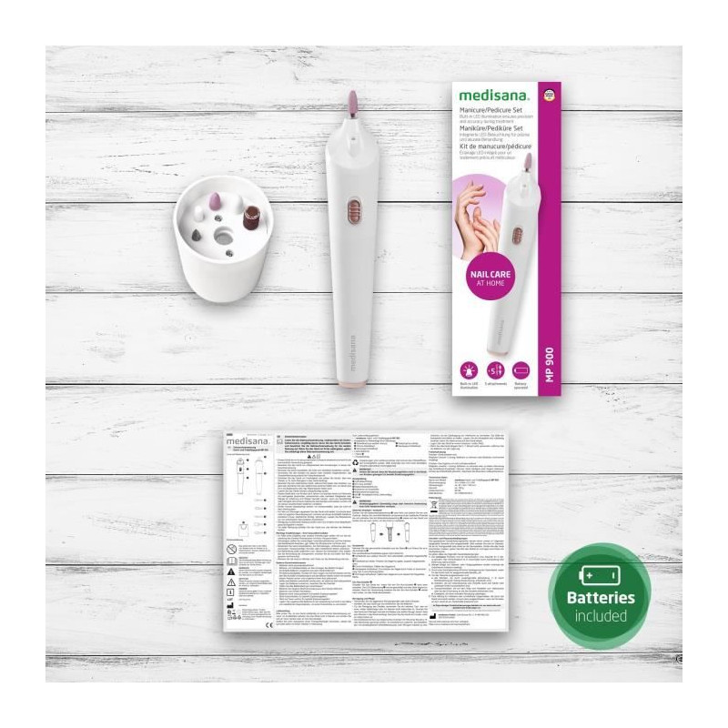 Prenez soin de vos mains et pieds avec le kit de manucure/pédicure sans fil MEDISANA MP 900. Compact et ergonomique, il traite efficacement ongles et cuticules grâce a son éclairage LED intégré. Livré avec 5 accessoires de qualité, il est facile a utiliser et idéal pour un soin a domicile. Fonctionne avec 2 piles AAA incluses.