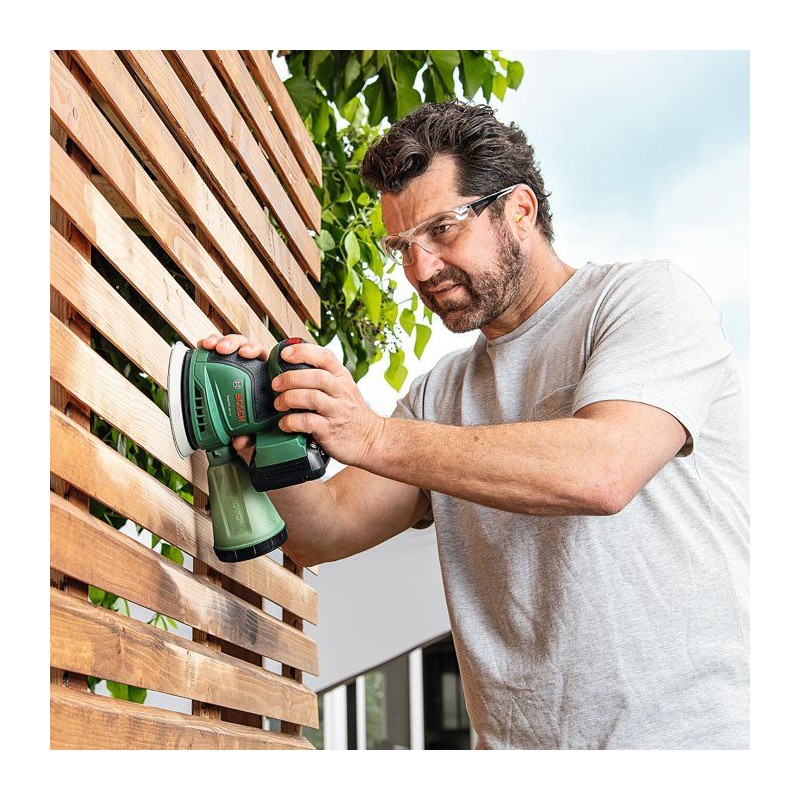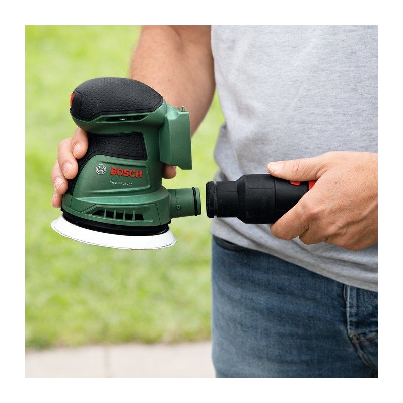 L'EasyOrbit 18V-10 Bosch allie légereté, compacité et grande efficacité pour une qualité de finition élevée sur les surfaces planes et galbées. Idéale pour le bois, le plâtre et les surfaces peintes, vernies ou polies de dimensions moyennes, cette ponceuse excentrique sans-fil est fournie avec un boîtier microfiltre retenant les débris et poussieres pour un maniement plus facile et un travail plus propre. L'électronique Syneon Bosch intégrée protege l'outil et la batterie. L'outil fait partie du systeme POWER FOR ALL 18V. Une seule batterie suffit pour tous les outils POWER FOR ALL 18V.