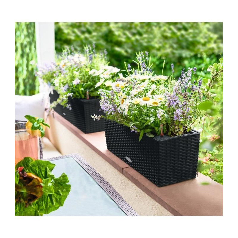 Délicatesse et raffinement pour vos fleurs ! L'aspect tressé Cottage s'accorde parfaitement a toutes les fleurs. Astucieux : le support quasiment invisible permet au pot et aux fleurs d'attirer tous les regards. Pour utilisation a l'extérieur, avec vis de trop plein. Bac d'arrosage de couleur neutre interchangeable - ouvert, avec poignées abaissables. S'utilise suspendu ou posé. Accessoire : Accroches-balconnieres LECHUZA : convient pour les BALCONERA 50 et 80, s'adapte au montage sur des rambardes jusqu'a 38 cm de largeur, ainsi qu'au mur. LECHUZA Complément aux accroche-balconnieres : Extensions modulables pour garde-corps. Ajustement sûr et parfait pour tous les garde-corps. S'adaptent aux BALCONERA 50 et 80. Disponibles en noir et blanc. Notre conseil : Si votre rambarde fait plus de 38 cm de largeur, vous pouvez acheter un set supplémentaire de fixations plus grandes pour balconnieres. Conseil: Par temps d'orage, votre bac d'arrosage s'enleve facilement afin de mettre vos plantes a l'abri, sans toutefois démonter BALCONERA entierement !