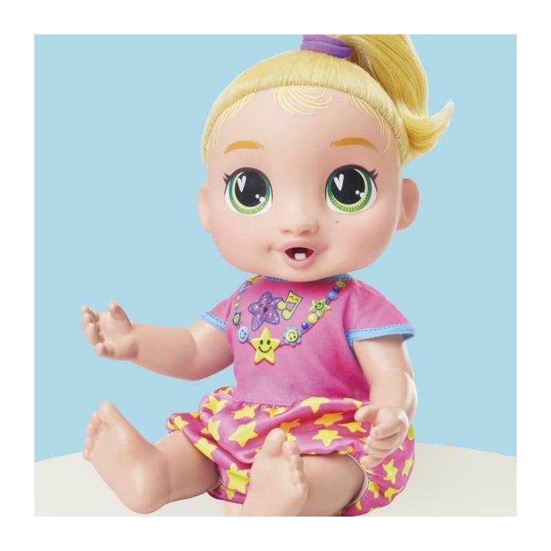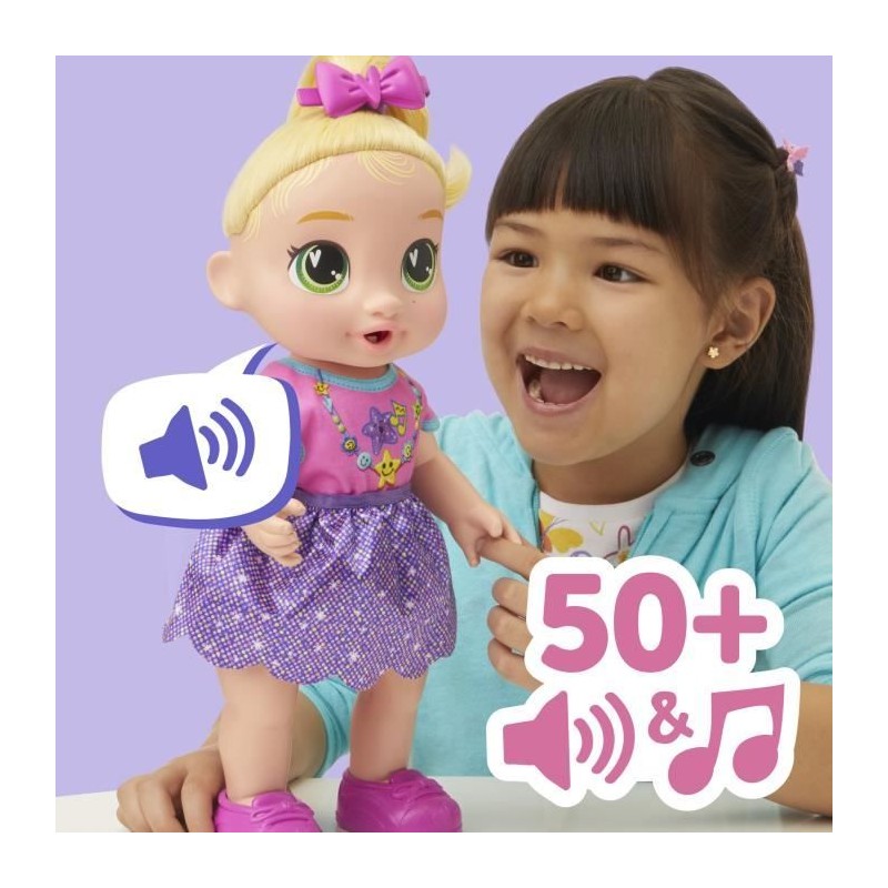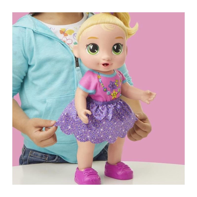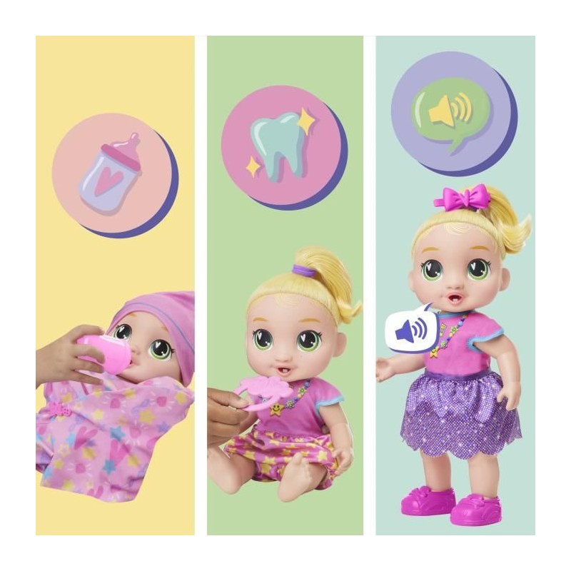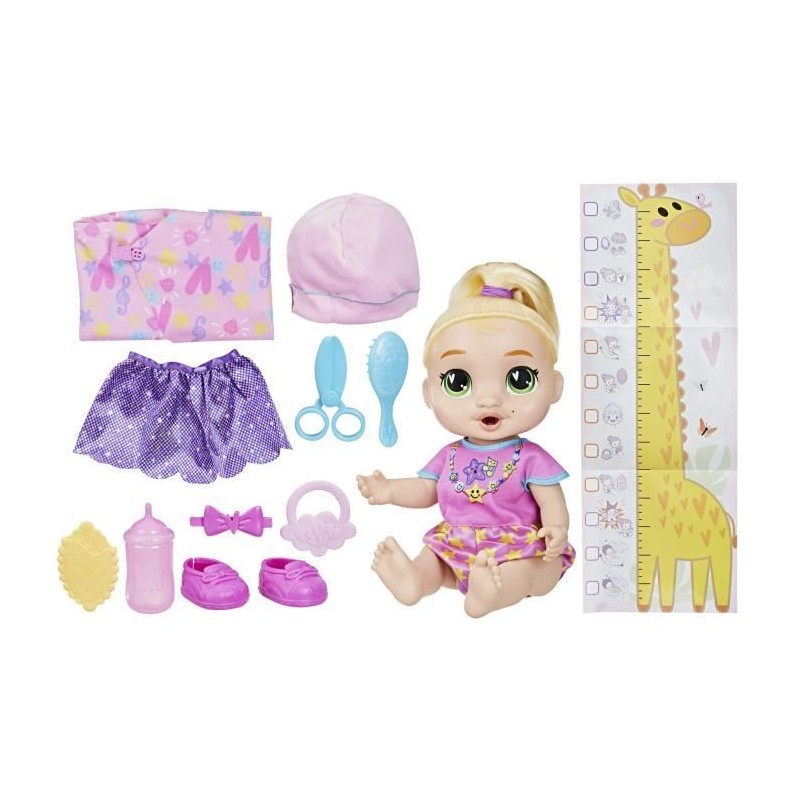 Découvrez la poupée interactive Baby Alive Bébé grandit LaLa GooGoo. Elle évolue a travers 3 étapes de croissance, de nouveau-né a tout-petit, tout en émettant plus de 75 sons et phrases. Inclus : accessoires de coiffure, biberon et tétine. Idéale des 3 ans !