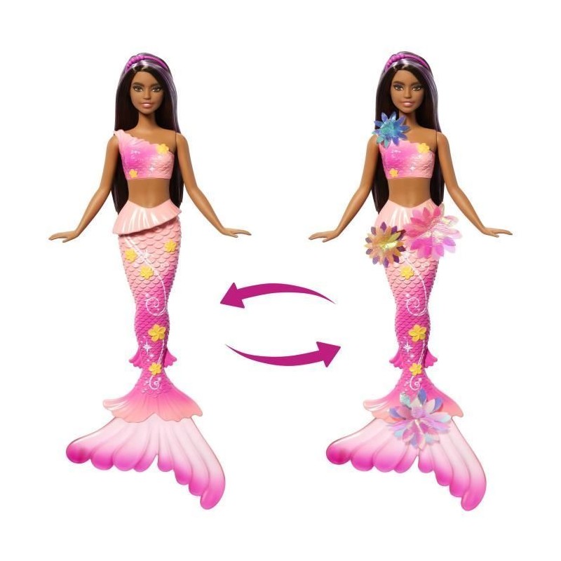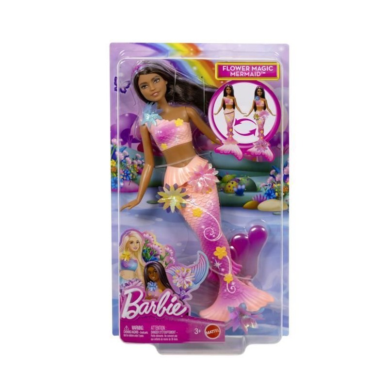 Faites éclore de belles histoires avec la poupée Barbie Sirene Fleur Magique ! Poussez le bouton a levier situé sur son dos pour voir les fleurs « éclore » comme par magie de son bustier a ses nageoires, encore et encore ! Les enfants peuvent également jouer avec cette poupée dans l'eau pour une magnifique éclosion sous-marine. Avec ses fleurs irisées, ses nageoires aux couleurs dégradées et son serre-tete perlé qui orne ses superbes longs cheveux bruns méchés de violet, cette poupée Barbie sirene rappelle la beauté des fonds marins. La poupée ne peut ni nager ni tenir debout toute seule. Les couleurs et les décorations peuvent varier.