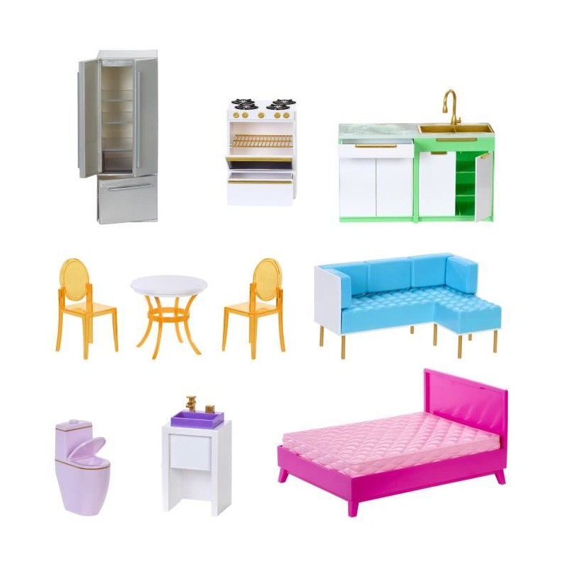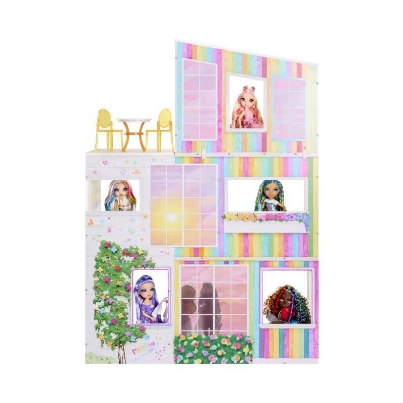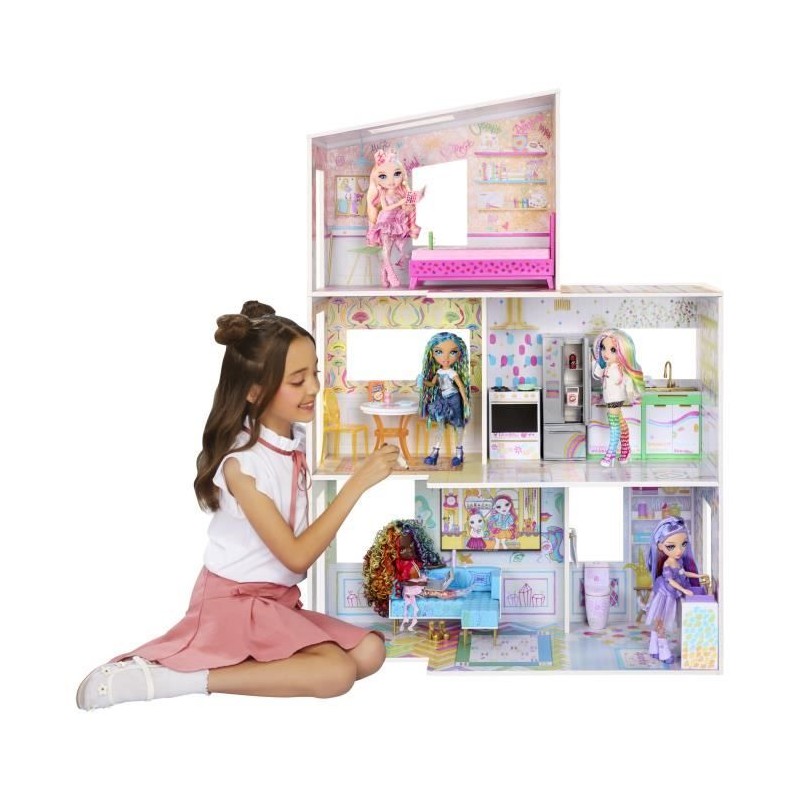 Créez la maison de vos reves Rainbow High et exprimez toute votre créativité. Vous allez pouvoir colorier les murs, le sol et recommencer encore et encore. Maison en bois, 114cm de haut, 3 étages et 6 pieces, 6 feutres, meubles et accessoires inclus. Des 4 ans.