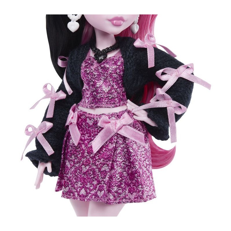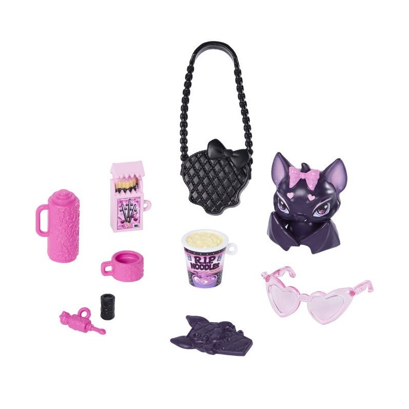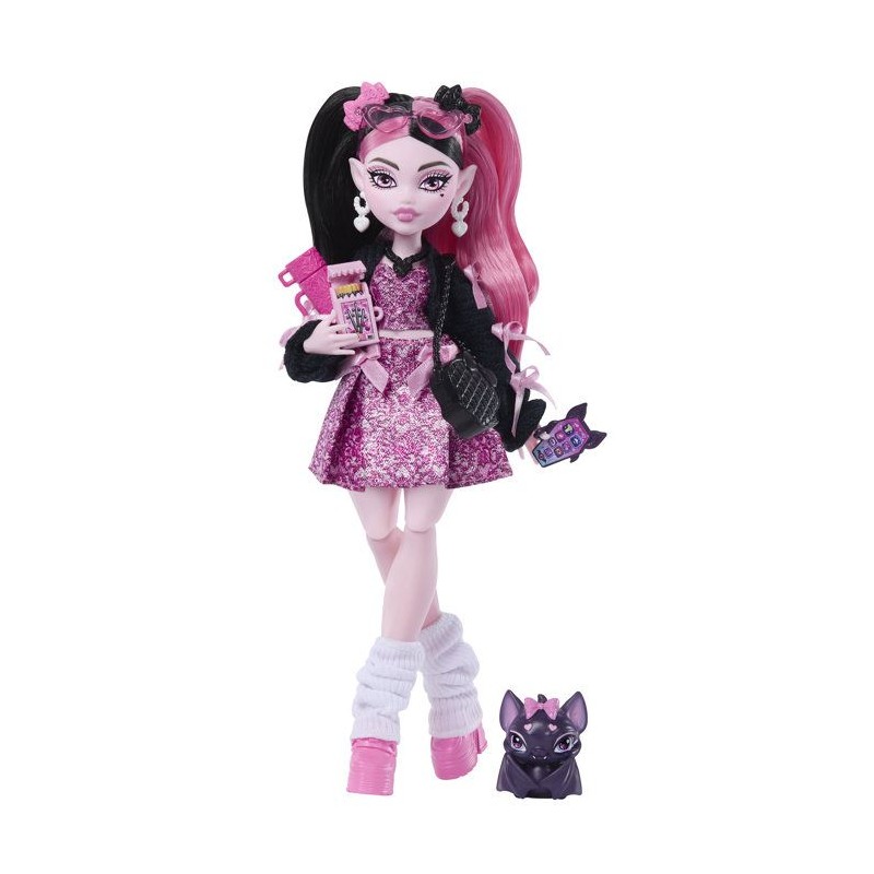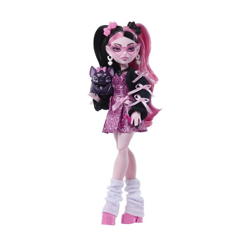 La poupée et son animal se préparent a rentrer en classe ! Robe rose et veste noire, guetres et rubans roses pour Draculaura. 7 accessoires sont inclus.