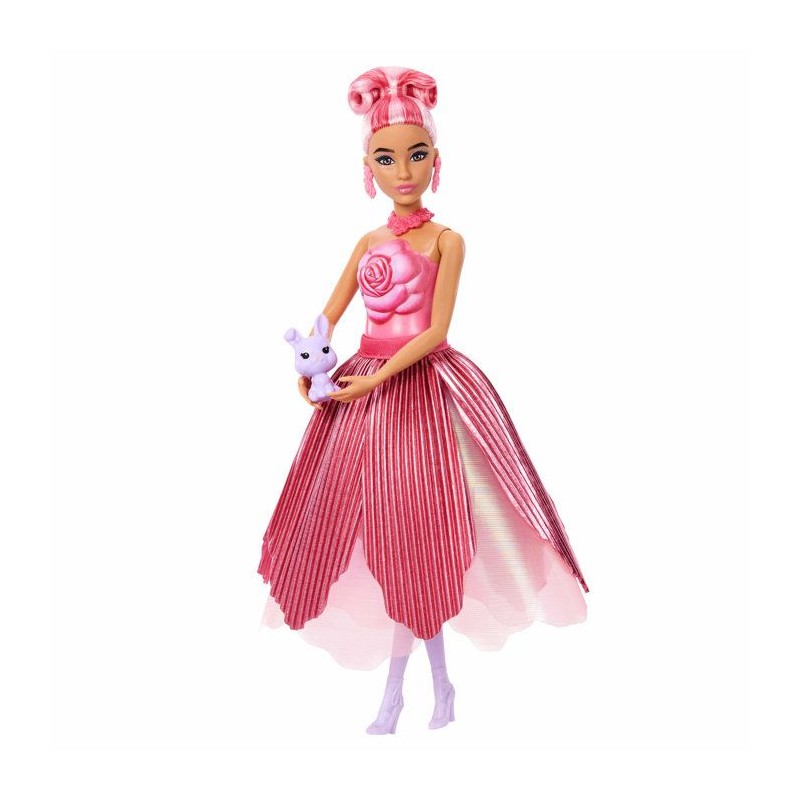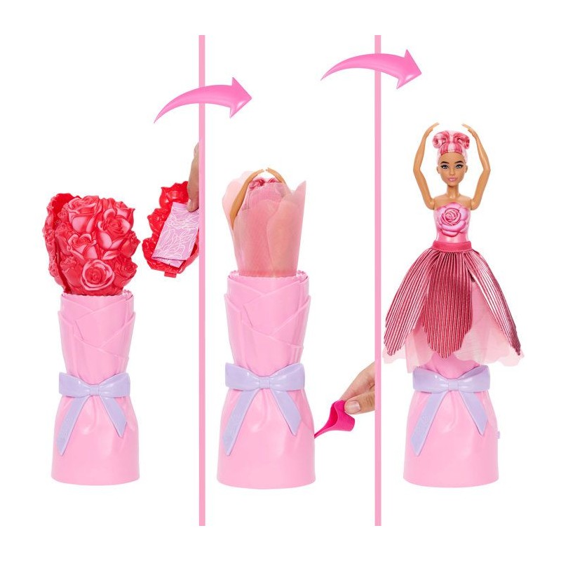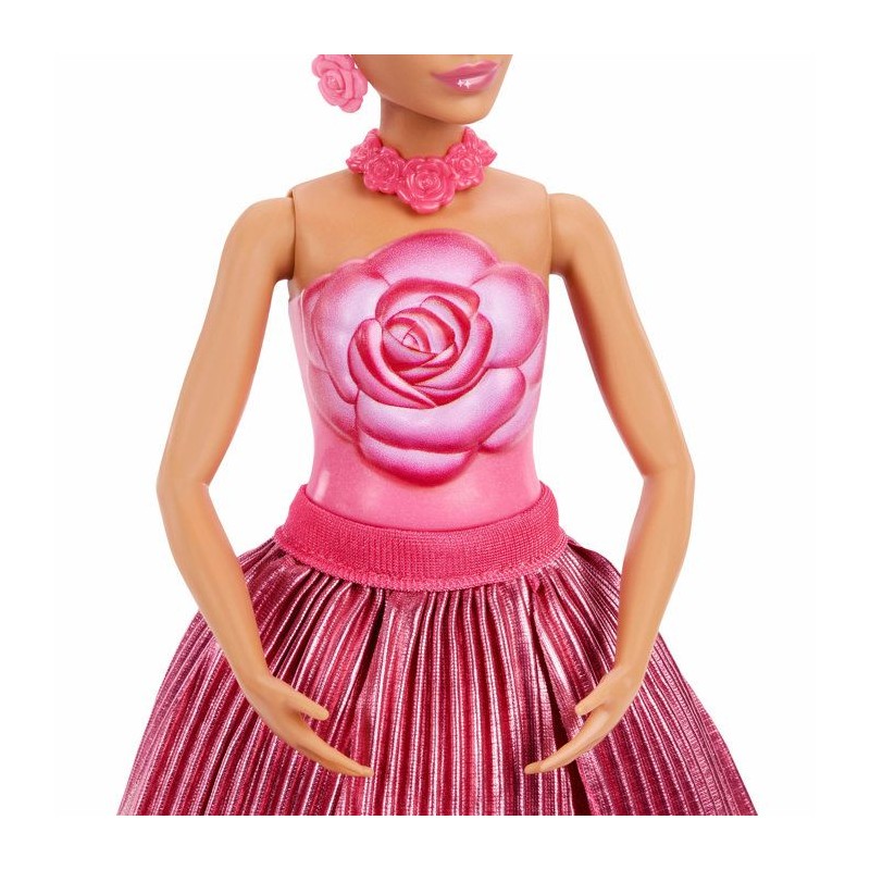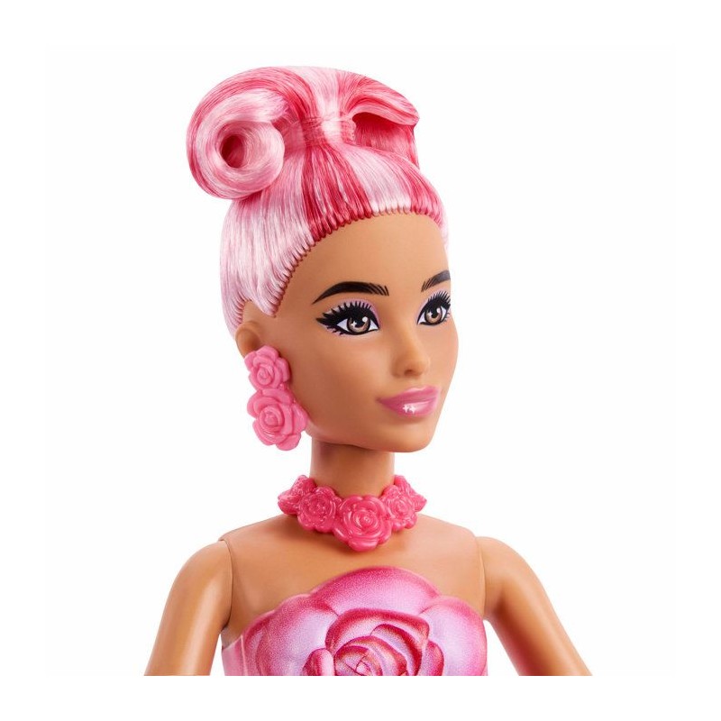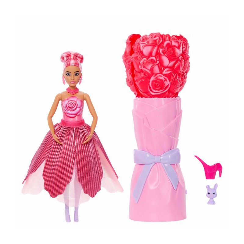 Barbie s'associe a la rose pour feter le printemps ! Des surprises sont cachées a l'intérieur de la fleur. Poupée et accessoires sont inclus.