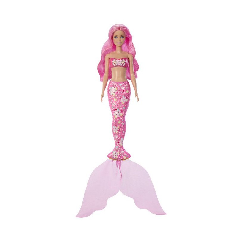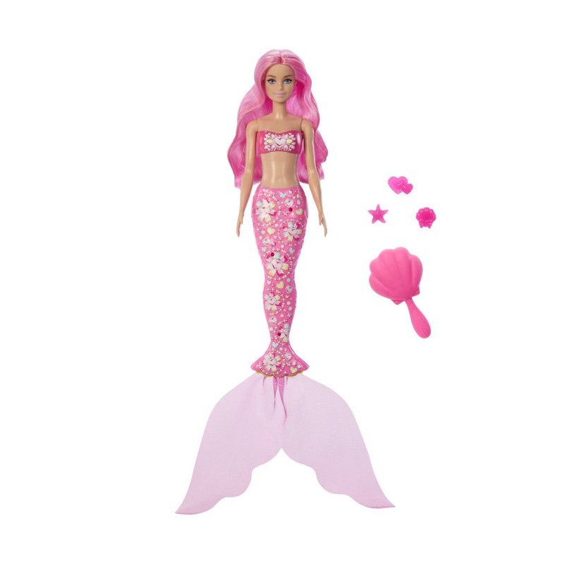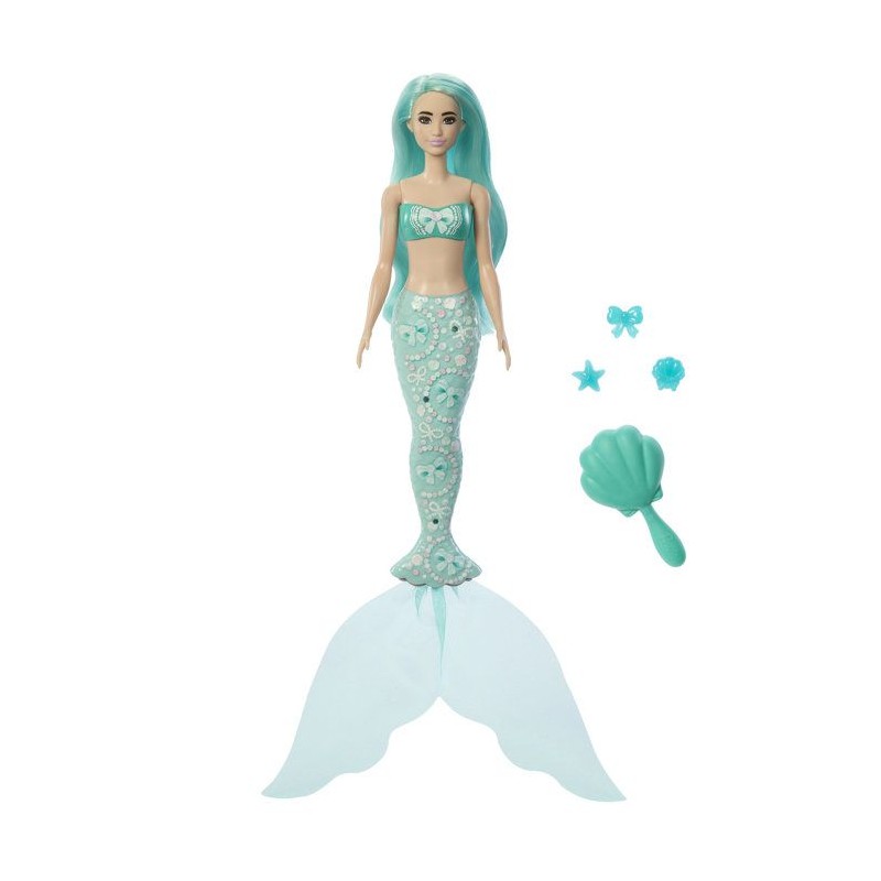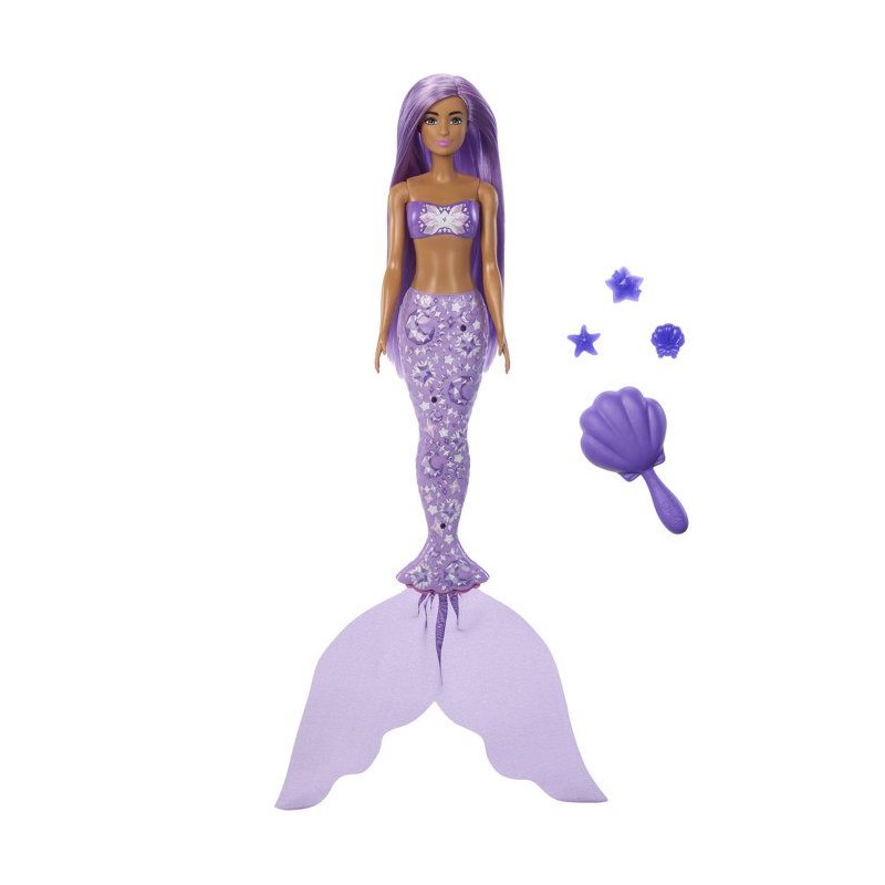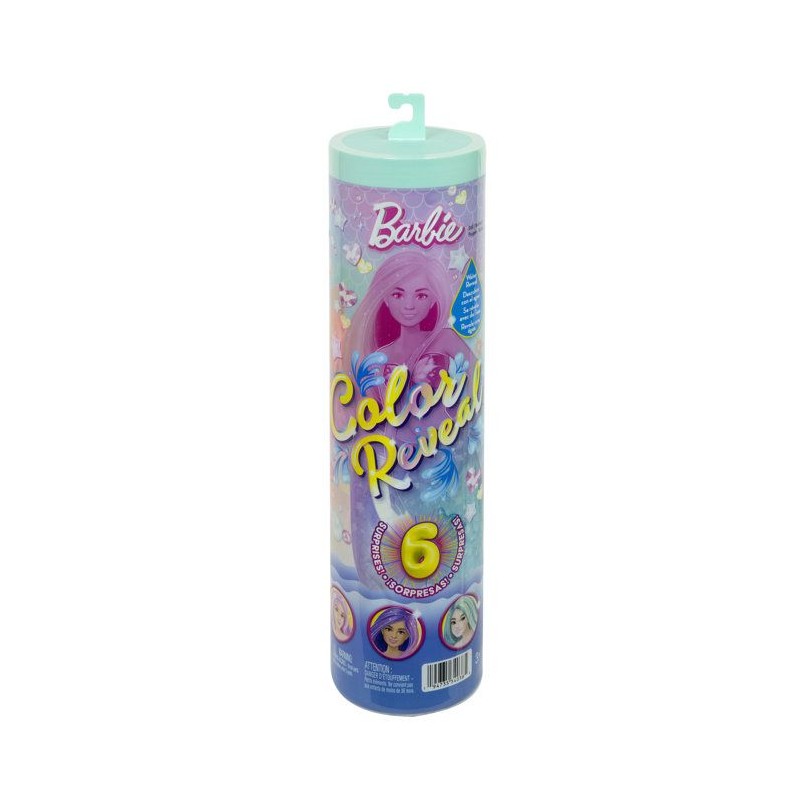 6 surprises sont a découvrir avec la sirene Barbie ! Des sirenes avec 1 changement de couleur, des bijoux pour la queue de la sirene et une brosse.