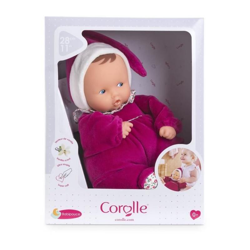 Découvrez le doudou Babipouce Rose Grenadine de COROLLE, un compagnon tout moelleux de 28 cm. Avec son visage vinyle rassurant et sa douce senteur de vanille, il est parfait des la naissance pour apaiser votre bébé.