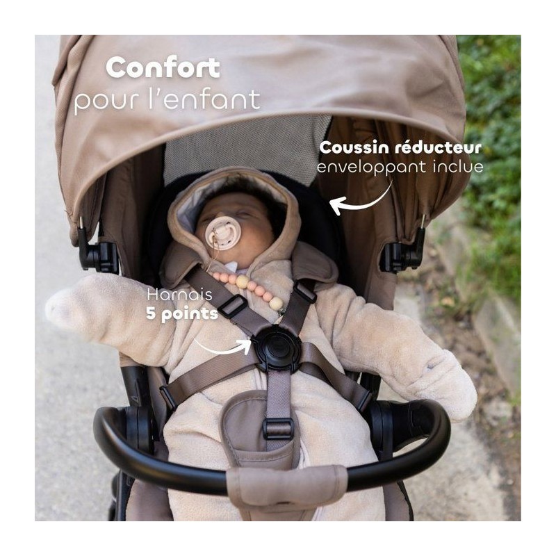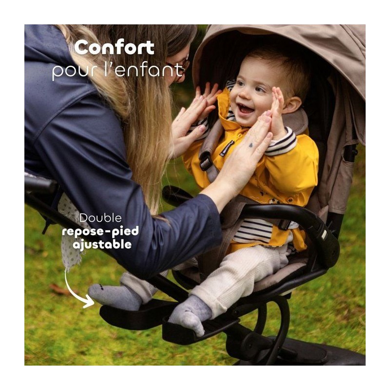 Une expérience de mobilité unique ! La poussette 360° a été pensée pour offrir un maximum de confort a votre enfant. Son siege rotatif a 360° permet de choisir entre la proximité avec les parents ou une ouverture totale sur le monde. Grâce a ses 7 positions, elle s'adapte parfaitement a tous les moments de la journée. Le coussin réducteur doux et enveloppant assure un maintien optimal des le plus jeune âge, tandis que le double systeme d'aération garantit un confort idéal en toutes circonstances. Les parents profiteront également d'un confort d'usage au quotidien. La poussette a une hauteur idéale pour partager les repas en extérieur. Son montage se fait facilement, sans outils, et son pliage compact d'une seule main permet de la ranger ou de la transporter sans effort. Les roues avant pivotantes a 360° offrent une maniabilité totale, tandis que la technologie EVA absorbe les vibrations et les chocs pour une conduite silencieuse et agréable. Le panier de rangement spacieux permet d'emporter tout le nécessaire. Tous les tissus sont amovibles et lavables pour un entretien facile. Côté sécurité, la poussette est équipée de roues avant a LED avec dynamo : elles s'illuminent automatiquement lorsque la poussette roule, sans pile ni batterie, pour voir et etre vu. La ceinture de sécurité 5 points et la barre de protection intégrée assurent une sécurité optimale. Enfin, le canopy XXL UPF 50+ protege efficacement votre enfant du soleil.