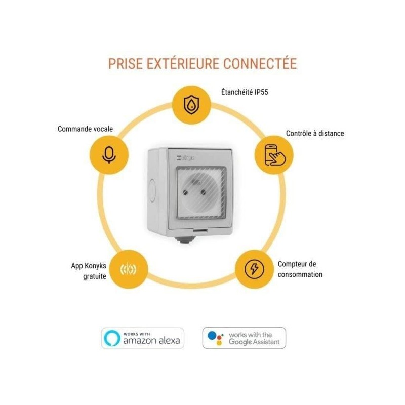La Konyks Pluviose est bien plus qu'une simple prise électrique. C'est une révolution pour votre jardin, terrasse ou tout espace extérieur. Résistante aux intempéries grâce a son indice de protection IP55, elle est conçue pour affronter la poussiere, les projections d'eau et meme les pluies les plus battantes. Profitez d'une connectivité sans faille avec le Wi-Fi et le Bluetooth, et pilotez vos appareils électriques a distance depuis votre smartphone ou par commande vocale via Google Home ou Alexa.