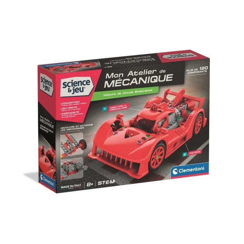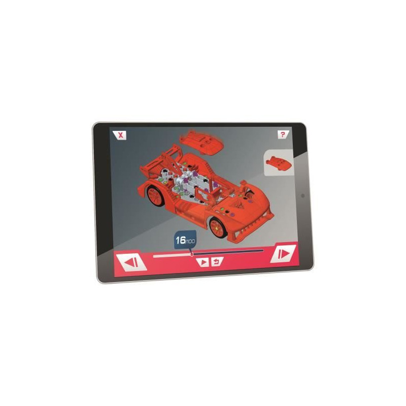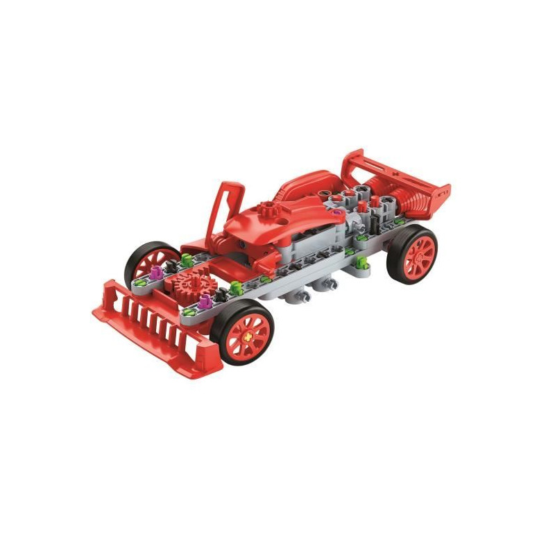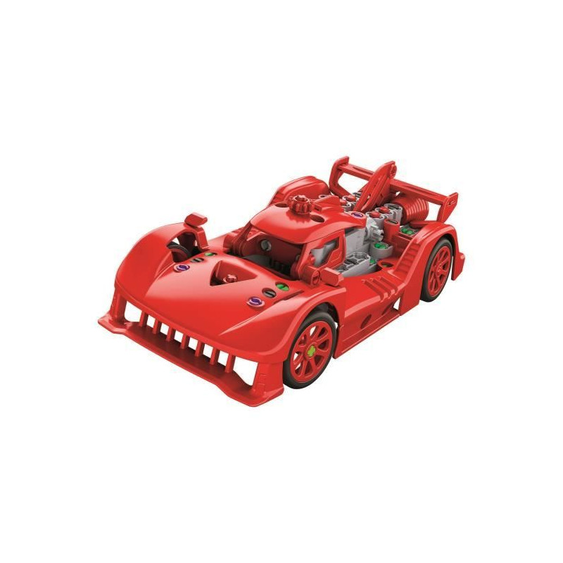 Ce coffret de construction permet aux enfants de créer un prototype de voiture de course. Le modele inclut des portes qui s'ouvrent et un systeme d'engrenages pour une direction fonctionnelle et le mouvement des pistons. Un manuel illustré et des instructions en 3D facilitent l'assemblage.