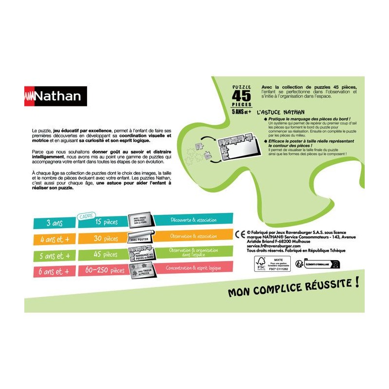 Le puzzle 45 pieces est un format idéal pour évoluer dans l'univers de ses héros préférés, des 5 ans. Le petit plus Nathan, c'est le poster a taille réelle des formes de pieces, pour bien les positionner lors de l'assemblage.