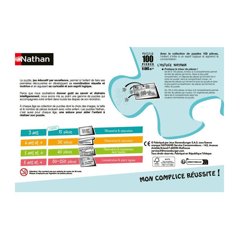 Le puzzle 100 pieces est un format idéal pour évoluer dans l'univers de ses héros préférés, des 6 ans. Le petit plus Nathan, c'est le trieur de pieces a 3 compartiments, pour classer les pieces selon leurs formes.