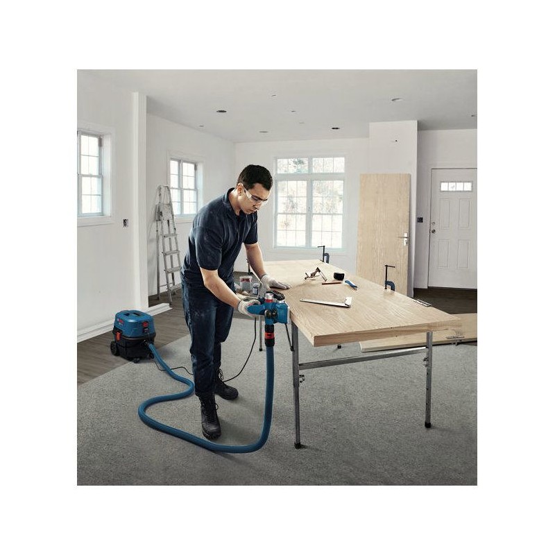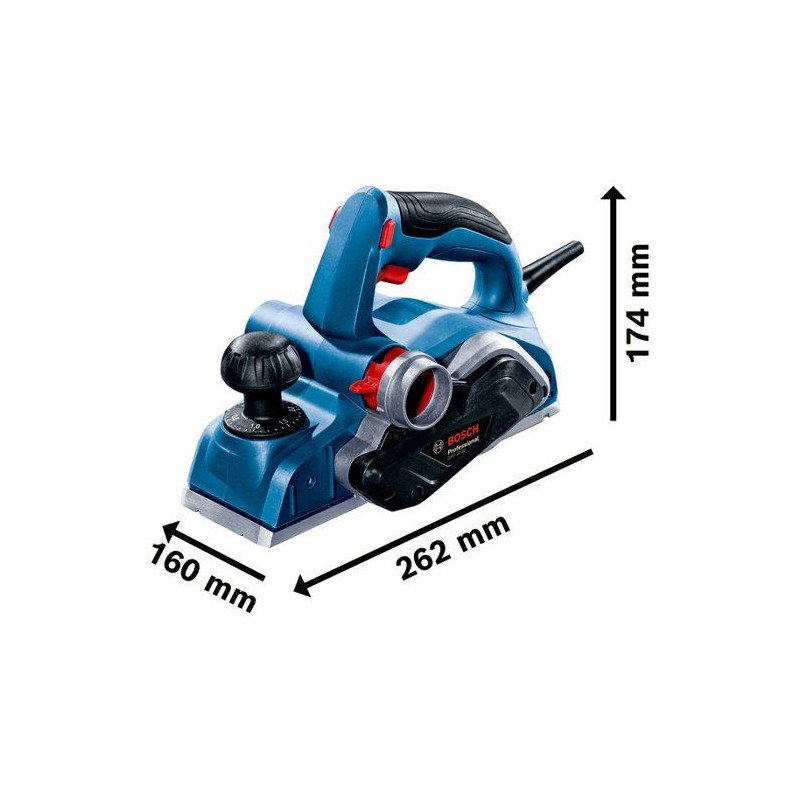 BOSCH GHO 20-82 - Rabot filaire compact avec semelle aluminium haute précision- Produit des surfaces planes et lisses avec son mécanisme de réglage de profondeur de passe précis et a sa semelle en aluminium de grande précision- Maîtrise parfaite et résultats homogenes grâce a la forme compacte et a la position optimisée du centre de gravité- Exclut tout blocage par des copeaux de bois avec son flux d'air optimisé et offre une flexibilité avec la possibilité d'éjecter les copeaux aussi bien du côté gauche que du côté droit. Référence produit : 06015A9100Type d'outil : Rabot électrique filairePuissance absorbée : 700 WTension d'alimentation : 230 VRégime a vide : 16?500 tr/minLargeur de rabotage : 82 mmProfondeur de passe réglable : 0 a 2 mmProfondeur de feuillure : 0 a 9 mmSemelle : Aluminium haute précisionÉjection des copeaux : Bilatérale (gauche ou droite)Poids net : 2,7 kgDimensions de l'emballage : 177 × 335 × 200 mmConception ergonomique : Oui, adaptée aux droitiers et gauchersAccessoires inclus : Butée parallele, clé de montage, sac a poussiereType d'emballage : Boîte cartonUsage recommandé : Rabotage de bois tendre et dur, finitions nettesNiveau de pression acoustique : 88 dB(A)Niveau de puissance acoustique : 96 dB(A)Incertitude K : 3 dB Rabot GHO 20-82 ProfessionalButée parallele (réf.?1 619 PC2 774)Clé de montage (réf.?1 619 PB4 239)Sac a poussiere (réf.?1 619 PC1 532)Notice d'utilisationEmballage en boîte carton