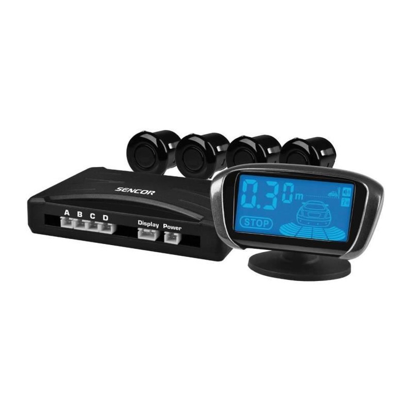 CAPTEURS DE STATIONNEMENT Sencor SCA PARK200 - Systeme de 4 capteurs de stationnement indiquant la distance de l'obstacle sur l'écran Activation automatique lorsque la marche arriere est choisie Connexion sans fil entre l'écran et le boîtier de commande Avertissements sonores/vocaux disponibles (Attention/Avertissement/Arret) Détection d'obstacle de 0,3 a 2 m du pare-chocs Conception toutes saisons (-40° a +80° C) Convient a toutes les voitures Le pack contient : 1 module de commande, 4 capteurs a ultrasons (noir brillant), 1 indicateur acoustique - écran LCD sans fil, 1 câble d'alimentation, 1 foret, 1 kit d'accessoires, 1 manuel d'instructions