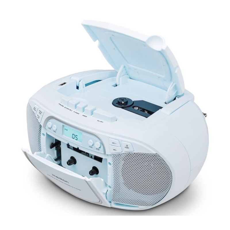Redécouvrez le plaisir d'un son riche et polyvalent avec ce boombox tout-en-un au look vintage. Équipé d'un lecteur CD/MP3/cassette, d'un port USB et d'une entrée AUX, il s'adapte a tous vos supports pour une expérience musicale sans limite. Sa radio FM PLL avec 30 stations préréglées et son systeme de mémorisation automatique vous permettent de retrouver vos stations favorites en un instant. L'écran LCD rétroéclairé bleu apporte une touche moderne, tandis que la mémoire programmable vous permet de personnaliser vos écoutes (jusqu'a 99 titres MP3). Avec une puissance musicale de 2 x 20 W, ce boombox est le compagnon idéal pour animer vos journées, a la maison comme en déplacement.