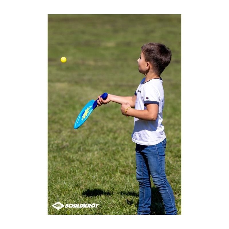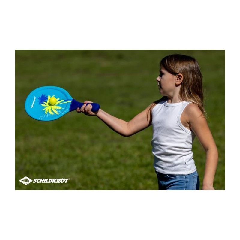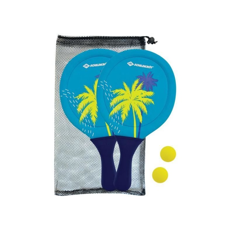 Raquettes de beachball - SCHILDKROT - Néoprene jaune/bleu impression verte - 2 balles Ø40mm - Sac filet refermable