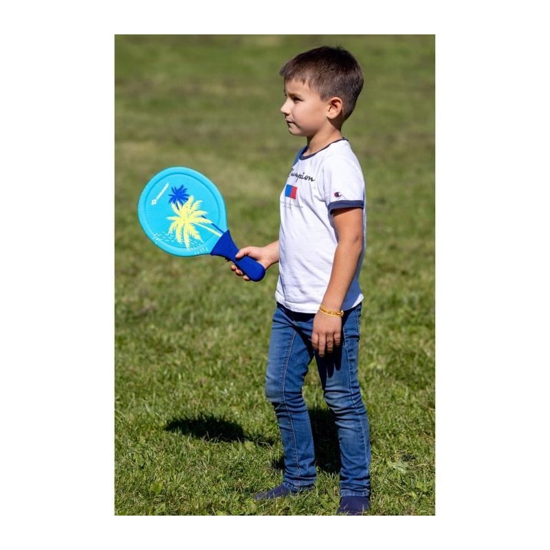 2 raquettes de beachball en néoprene jaune néon/bleu avec impression verte, recouvertes de néoprene élastique donnant un effet trampoline maximal (longueur 40 cm, largeur 22,5 cm, épaisseur 0,8 cm), 2 balles Ø40mm, dans un sac en filet refermable avec cordon de serrage.