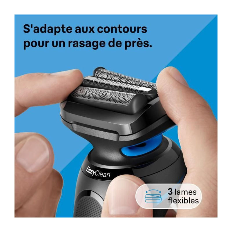 Le rasoir électrique Braun Series 5 51-B1000s offre un rasage efficace meme sur les barbes les plus dures. Grâce a la technologie AutoSense, il ajuste sa puissance selon la densité de votre barbe. Son design noir et bleu apporte une touche de modernité a votre routine de soins.