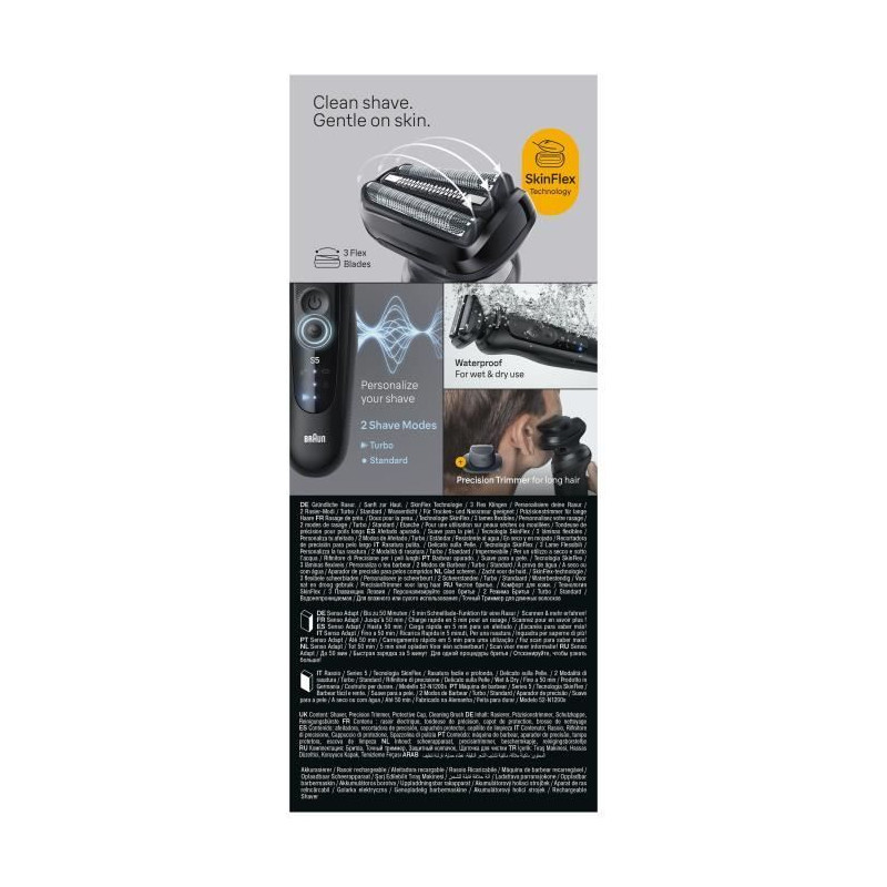 Le rasoir électrique Braun Series 5 offre un rasage facile et rapide. Les 3 lames flexibles s'adaptent pour suivre confortablement les contours de votre visage. 2 modes de rasage, Turbo et Standard, vous permettent de personnaliser votre rasage selon vos besoins.
