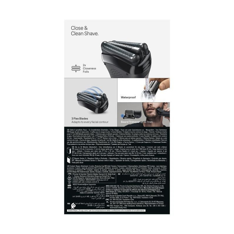 Le rasoir électrique Braun Series 3 assure un rasage impeccable grâce a ses 2 grilles et 1 tondeuse. Ses lames flexibles épousent les contours du visage. Utilisable sur peau seche ou mouillée, il offre un confort optimal, meme sous la douche.
