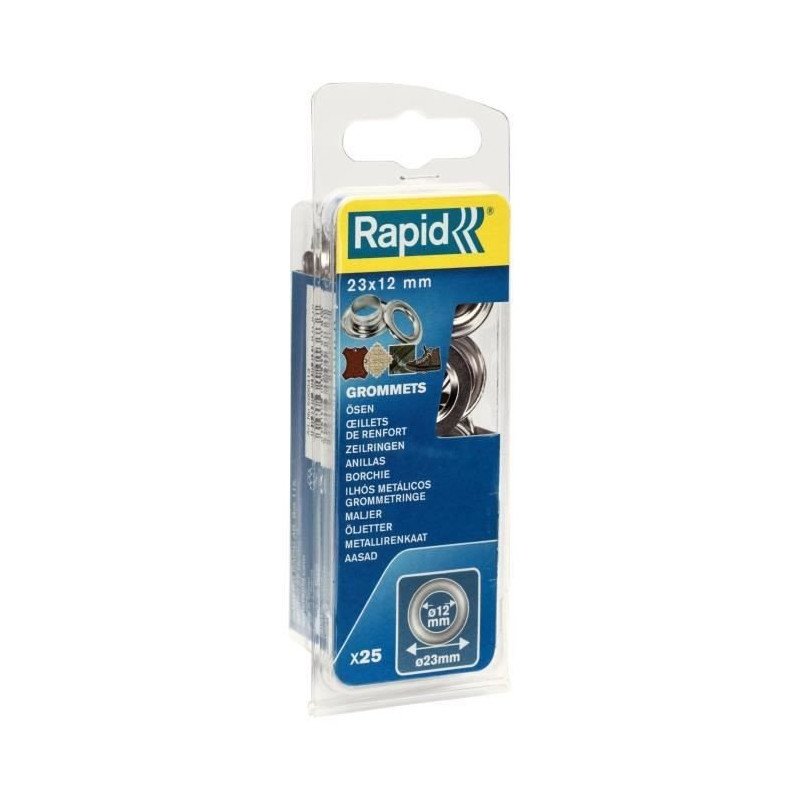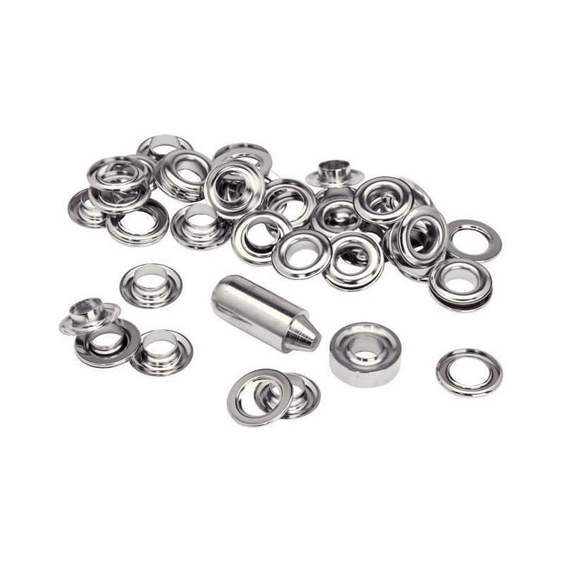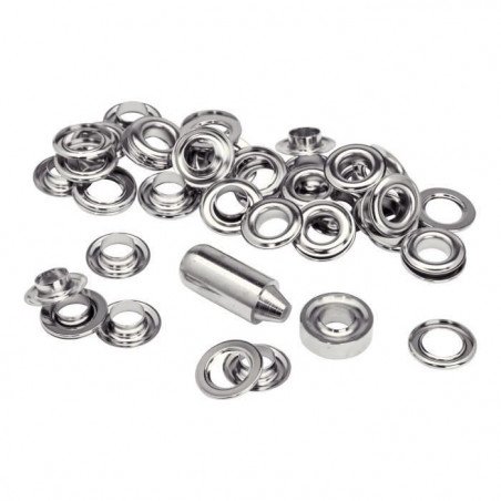 oeillets de renfort - 12mm - Blister de 25 pieces - Fabriqués en aluminium de haute qualité - En deux pieces : doit etre placé dans un matériau pré-perforé et etre enfoncé a l'aide du tas a river également fourni - Parfait pour les chaussures, ceintures, sacs, voile...