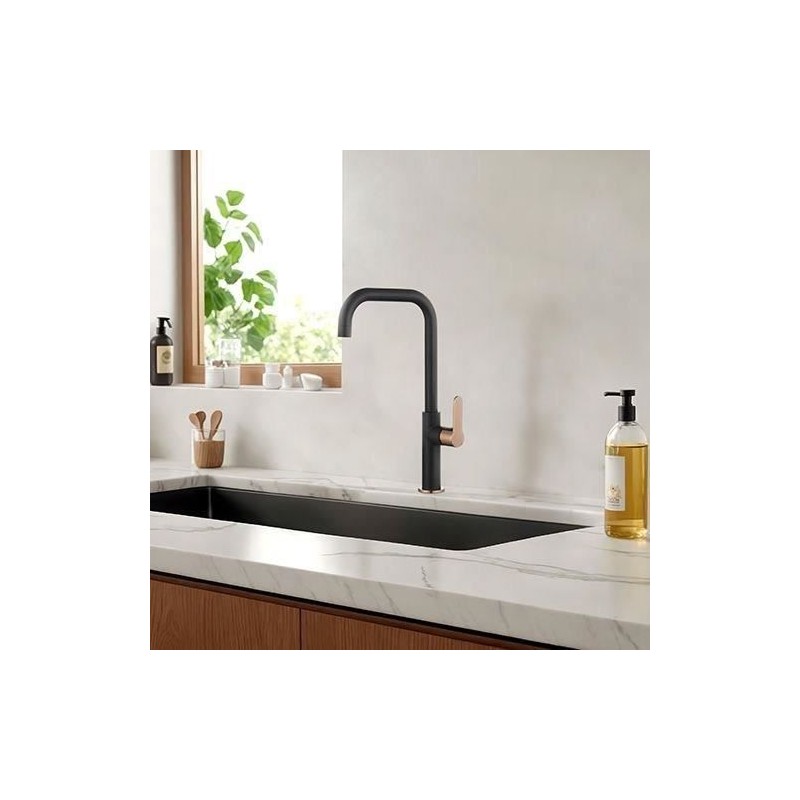 Apportez une touche de modernité et de raffinement a votre cuisine avec le mitigeur évier LAOBANE. Son design contemporain et ses finitions haut de gamme en font un véritable bijou fonctionnel. Ses atouts : design moderne et silhouette épurée, corps en laiton noir mat avec finition PVD rose gold pour une brillance durable, poignée en métal ergonomique, bec mobile pour une flexibilité optimale, cartouche céramique Ø 25 mm pour un contrôle précis. Dimensions : hauteur totale 377 mm, hauteur sous bec 291 mm, saillie 189 mm.