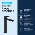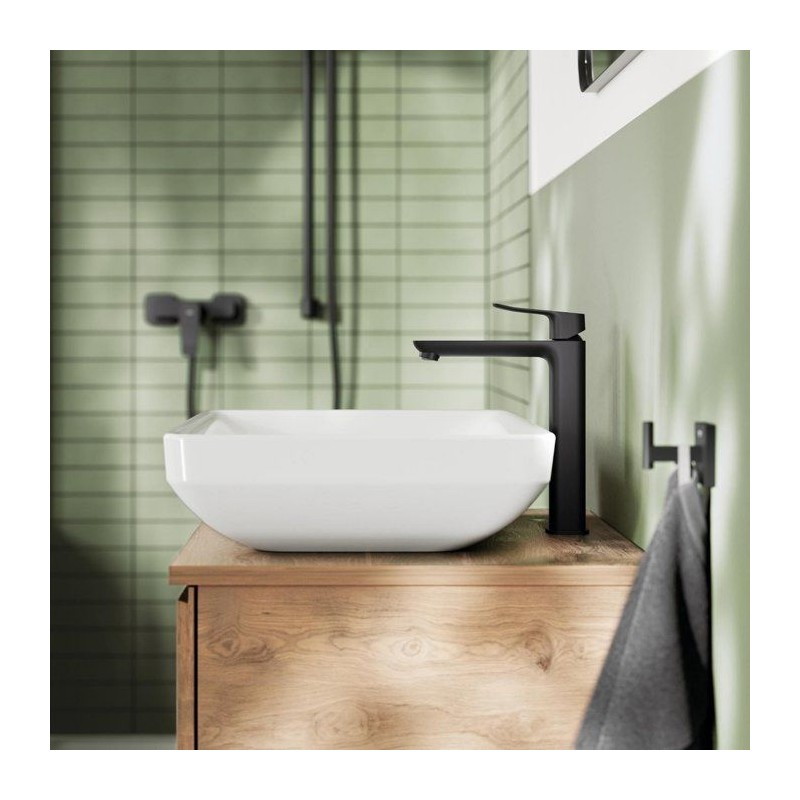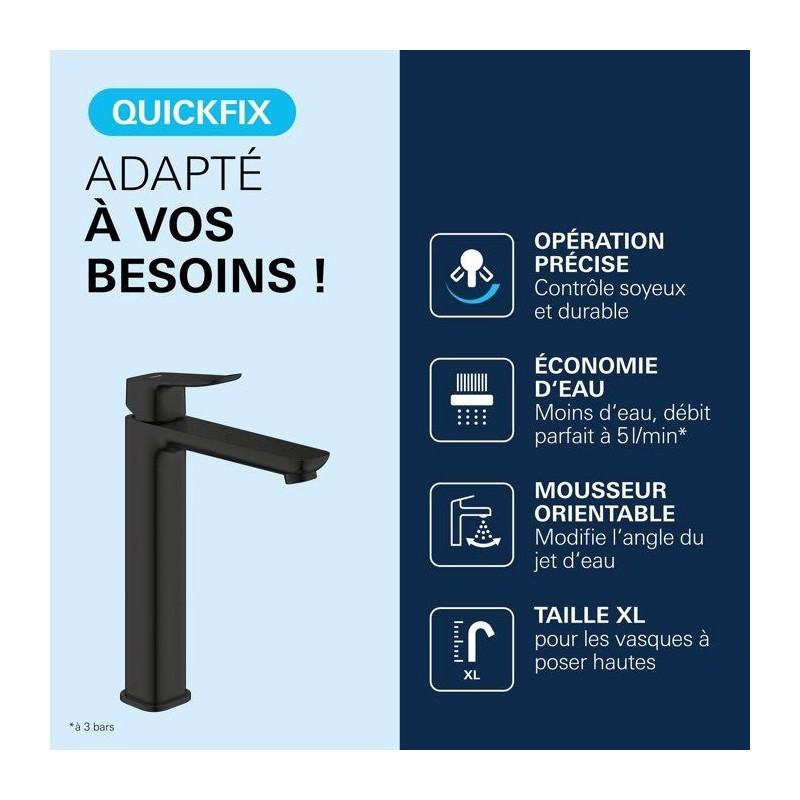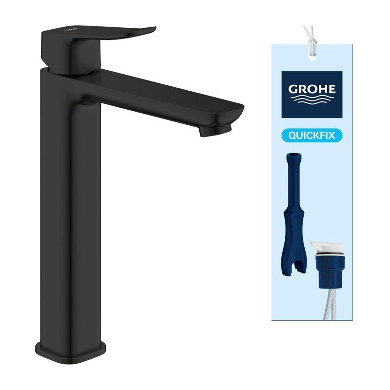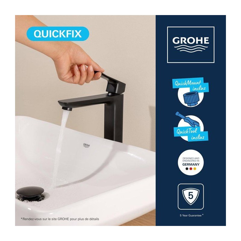 Découvrez le mitigeur de lavabo GROHE DICE Taille XL Noir mat, un mitigeur de la gamme GROHE DICE conçu pour offrir confort d'utilisation, performance durable et design moderne. Pensé pour s'intégrer facilement dans toutes les salles de bain, ce modele de taille XL associe une finition haut de gamme et un levier métallique précis pour une utilisation fluide au quotidien. Grâce a la technologie GROHE SilkMove, la cartouche en céramique garantit un contrôle souple et durable du débit et de la température. Le limiteur de débit et le limiteur de température vous permettent de réaliser des économies d'eau tout en profitant d'un jet parfaitement maîtrisé. Avec un débit maximal de 5 l/min a 3 bars, ce mitigeur allie efficacité hydraulique et confort d'utilisation. Sa version réhaussée est spécialement conçue pour les vasques a poser, offrant une grande liberté de mouvement et un confort optimal. L'installation est facilitée grâce au systeme GROHE FastFixation/QuickMount ainsi qu'a l'outil QuickTool inclus selon les versions. Les flexibles de raccordement souples et le corps lisse avec vidage clic-clac (selon modele) completent un ensemble pensé pour durer. La finition longue durée résiste parfaitement au calcaire, aux rayures et a l'usure du quotidien. Un choix élégant et fiable pour valoriser votre salle de bain.
