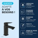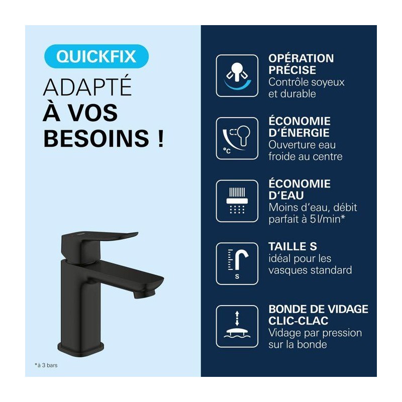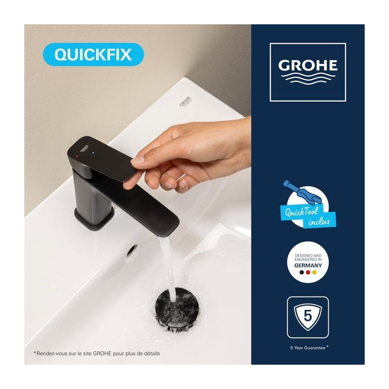 Découvrez le mitigeur de lavabo GROHE DICE Taille S Ch3 Noir mat, un mitigeur de la gamme GROHE DICE conçu pour offrir confort d'utilisation, performance durable et design moderne. Pensé pour s'intégrer facilement dans toutes les salles de bain, ce modele de taille S associe une finition haut de gamme et un levier métallique précis pour une utilisation fluide au quotidien. Grâce a la technologie GROHE SilkMove, la cartouche en céramique garantit un contrôle souple et durable du débit et de la température. Le limiteur de débit et le limiteur de température vous permettent de réaliser des économies d'eau tout en profitant d'un jet parfaitement maîtrisé. Avec un débit maximal de 5 l/min a 3 bars, ce mitigeur allie efficacité hydraulique et confort d'utilisation. Ce modele est équipé d'une cartouche SilkMove Économie d'énergie avec ouverture eau froide au centre, idéale pour réduire la consommation énergétique sans effort. L'installation est facilitée grâce au systeme GROHE FastFixation/QuickMount ainsi qu'a l'outil QuickTool inclus selon les versions. Les flexibles de raccordement souples et le corps lisse avec vidage clic-clac (selon modele) completent un ensemble pensé pour durer. La finition longue durée résiste parfaitement au calcaire, aux rayures et a l'usure du quotidien. Un choix élégant et fiable pour valoriser votre salle de bain.